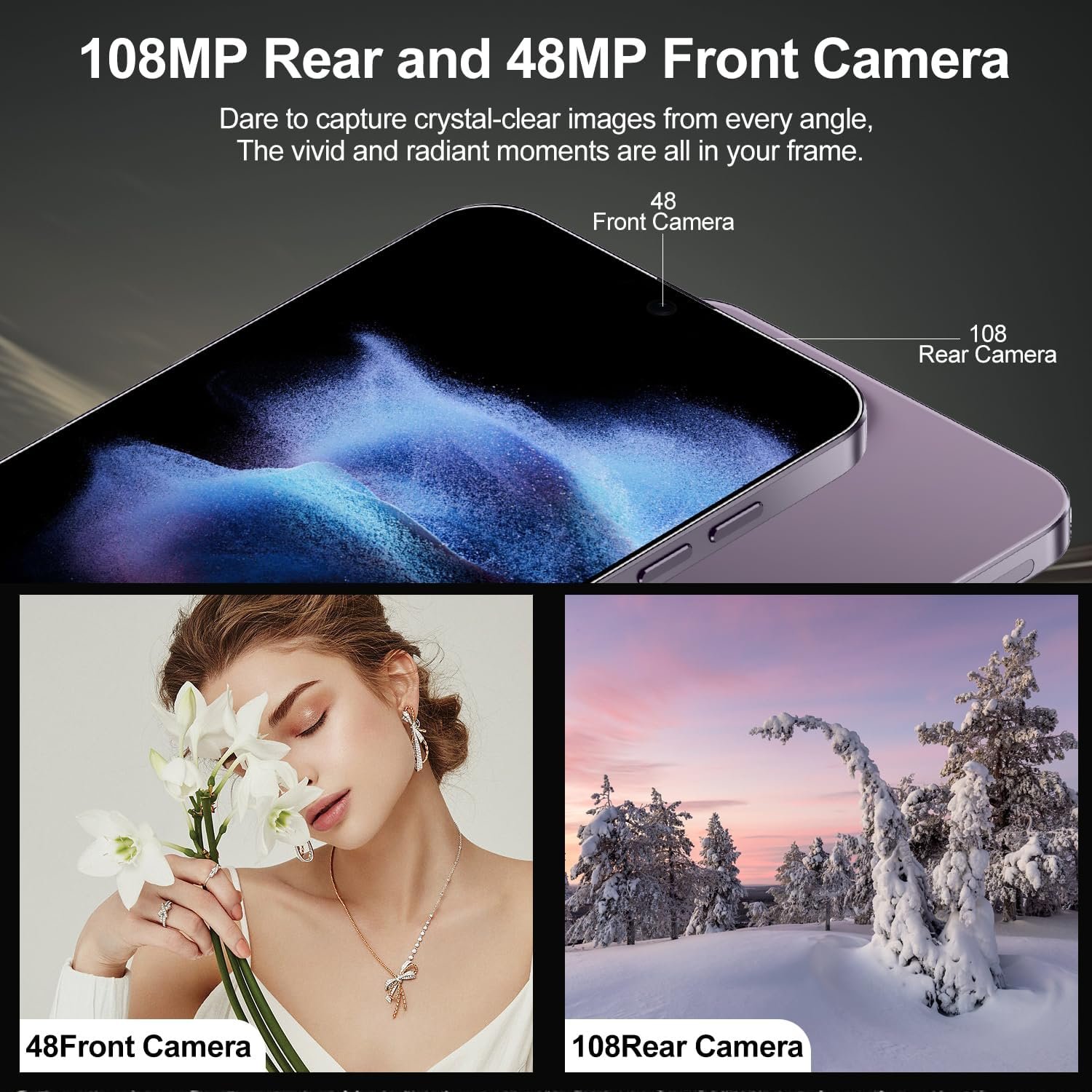 【48MP+108MP+6.8″HD Screen】108MP main camera and a 48MP front facing camera,Equipped with extra-large 6.8″HD Screen High Definition Storage of Pictures and Videos Recording of Good Life