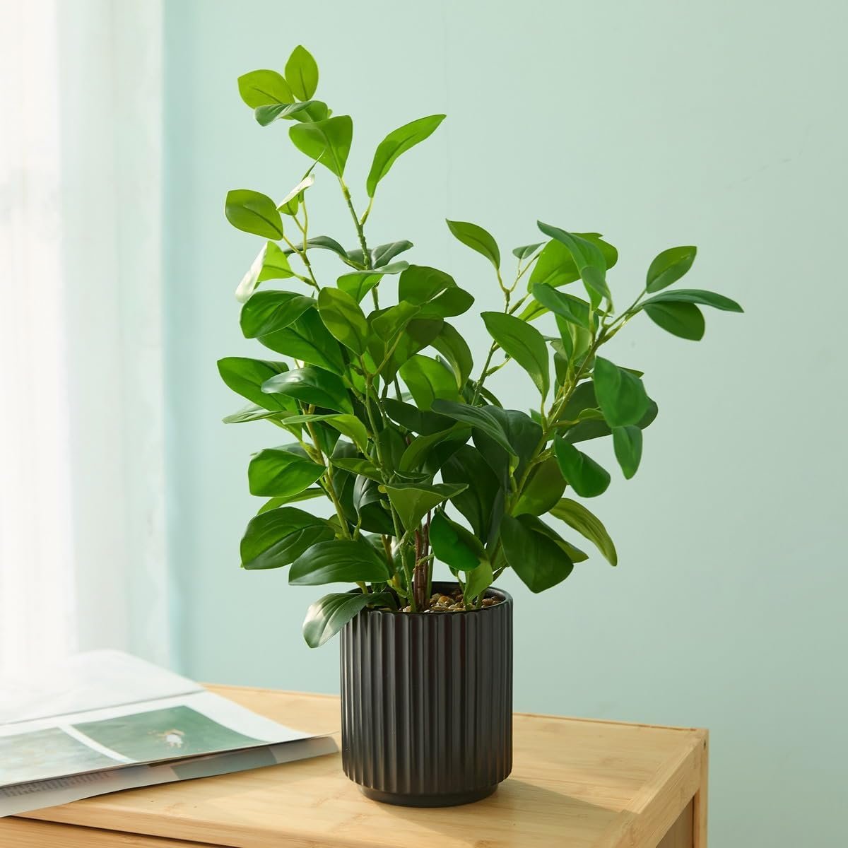 16 inch Artificial Plants Indoor Realistic Touching Evergreen Leaf Fake Plant with Creamic Black Pot for Home Office Living Room Bathroom Office Table Bookshelf Decor