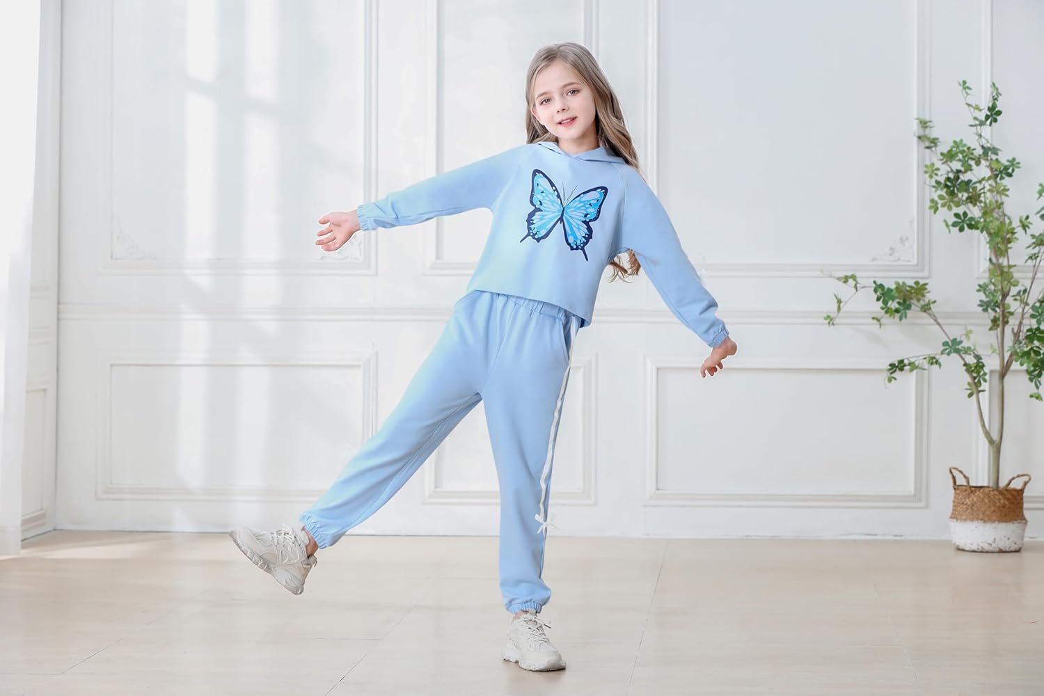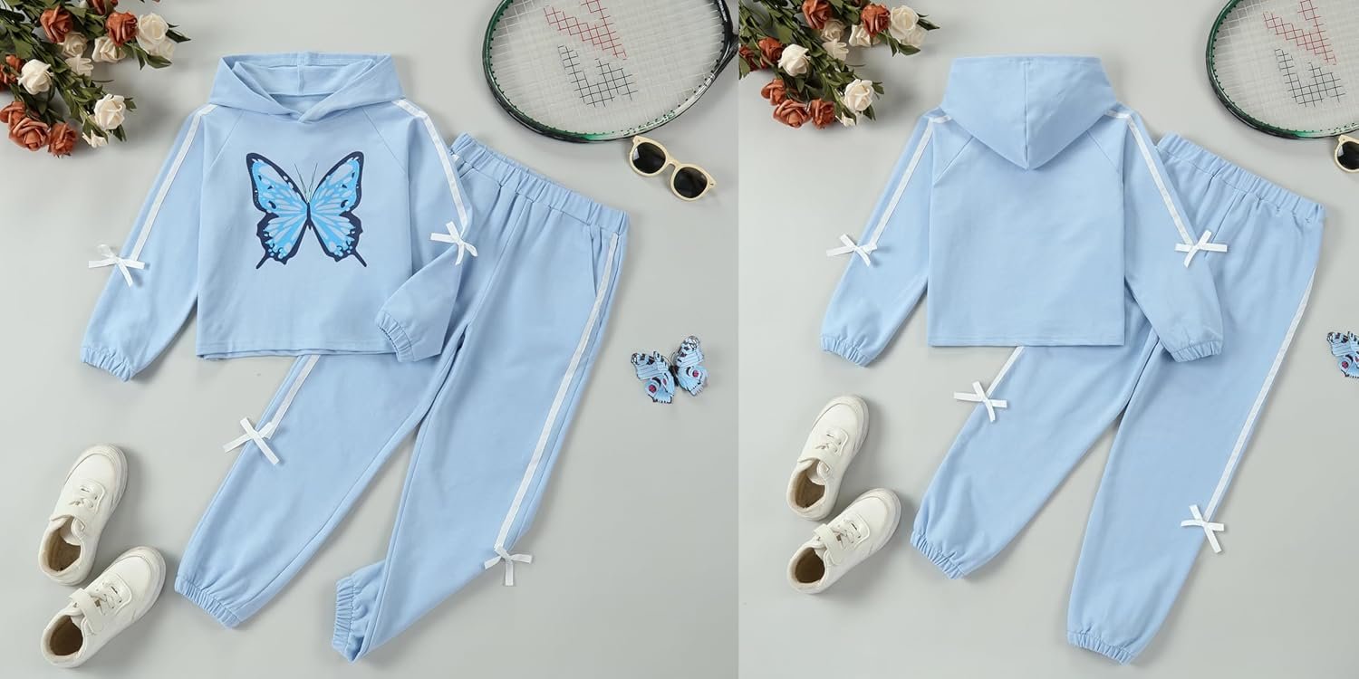 Girls Outfit Sets Butterfly Printed Pullover Hooded Crop Tops Sweatshirt Suit