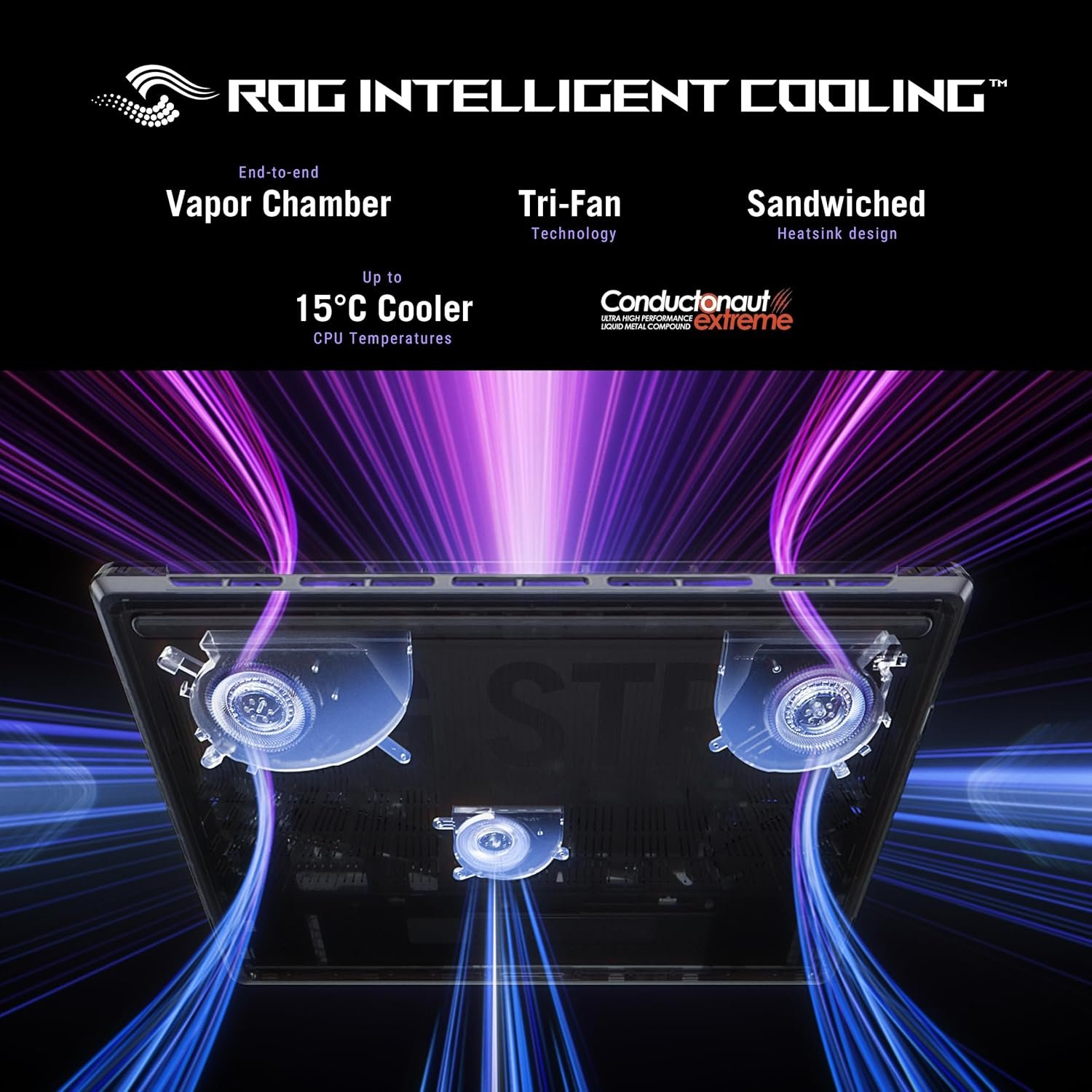 STATE-OF-THE-ART ROG INTELLIGENT COOLING – ROG’s advanced thermals keep your system cool, quiet and comfortable. State of the art cooling equals best in class performance. Featuring an end-to-end vapor chamber, tri-fan technology and Conductonaut extreme liquid metal applied to the chipset delivers fast gameplay.