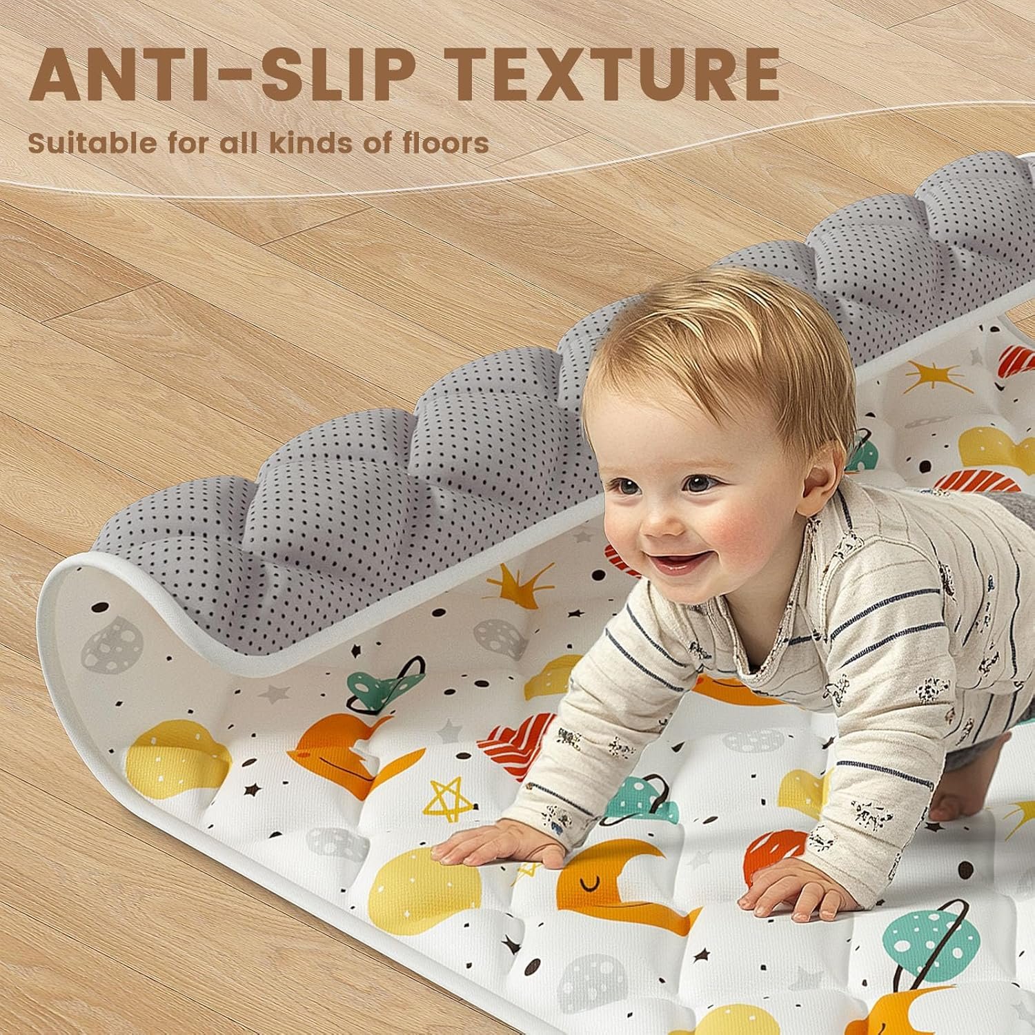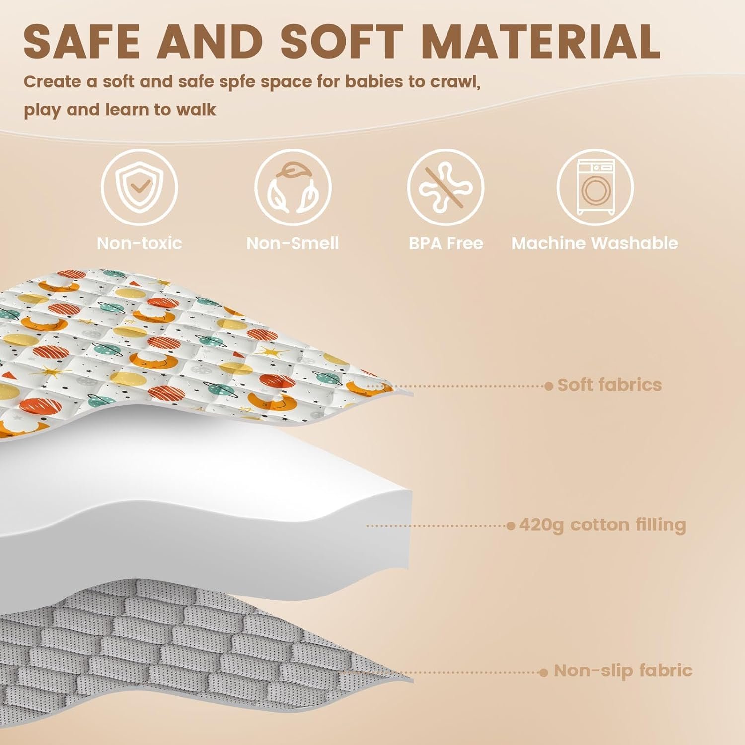 Super Soft & Breathable: Unlike other sponge-filled baby play mat on the market, our crawling mat is filled with 420 grams of soft sponge and uses a special sewing process to make its surface fluffy and thicker, greatly improving the softness and breathability, allowing the baby to play more comfortably.