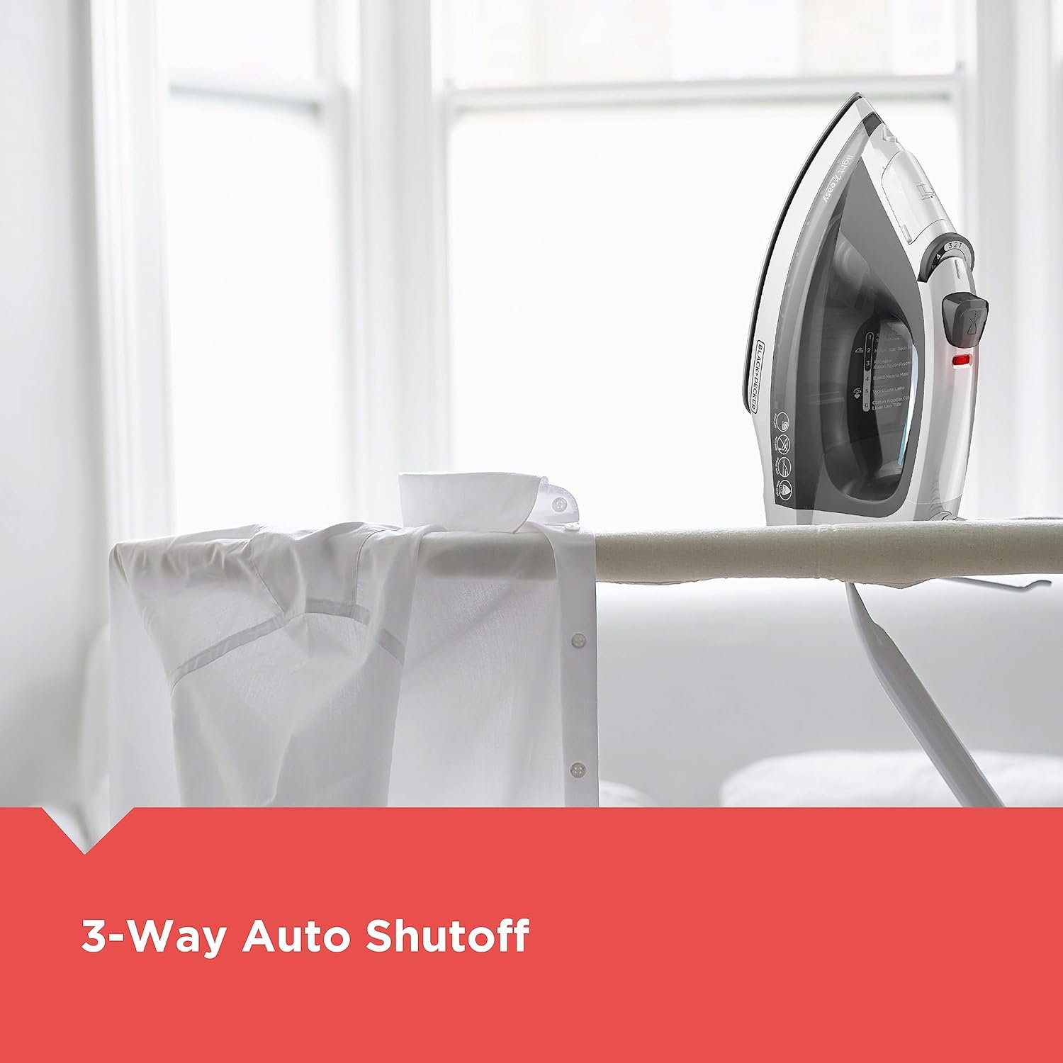 3-Way Auto Shutoff – For added peace of mind, the iron shuts off when left unattended for 30 seconds on its side or soleplate, and after 8 minutes on the heel rest.
