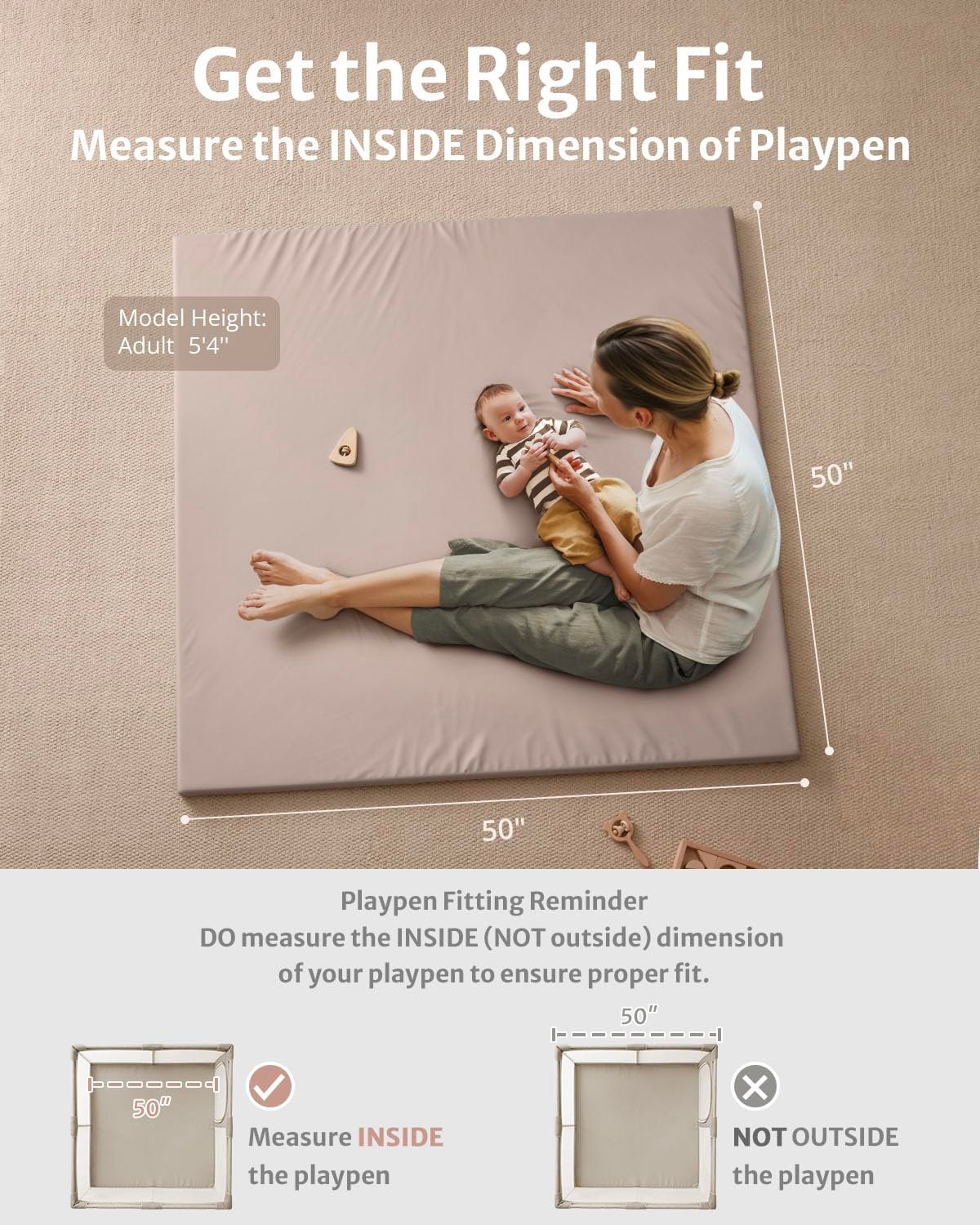 Perfect Fit & Stylish Decor: Our playpen mat fits 50×50 inches playpens and works seamlessly in any space, from the living room to the nursery. Its versatile use makes it a baby essential. The soft, earthy taupe color adds an elegant and calming vibe to your home, making your baby’s play space feel cozy and serene. NOTE:Measure your playpen’s inner diameter/available space before buying to ensure a proper fit