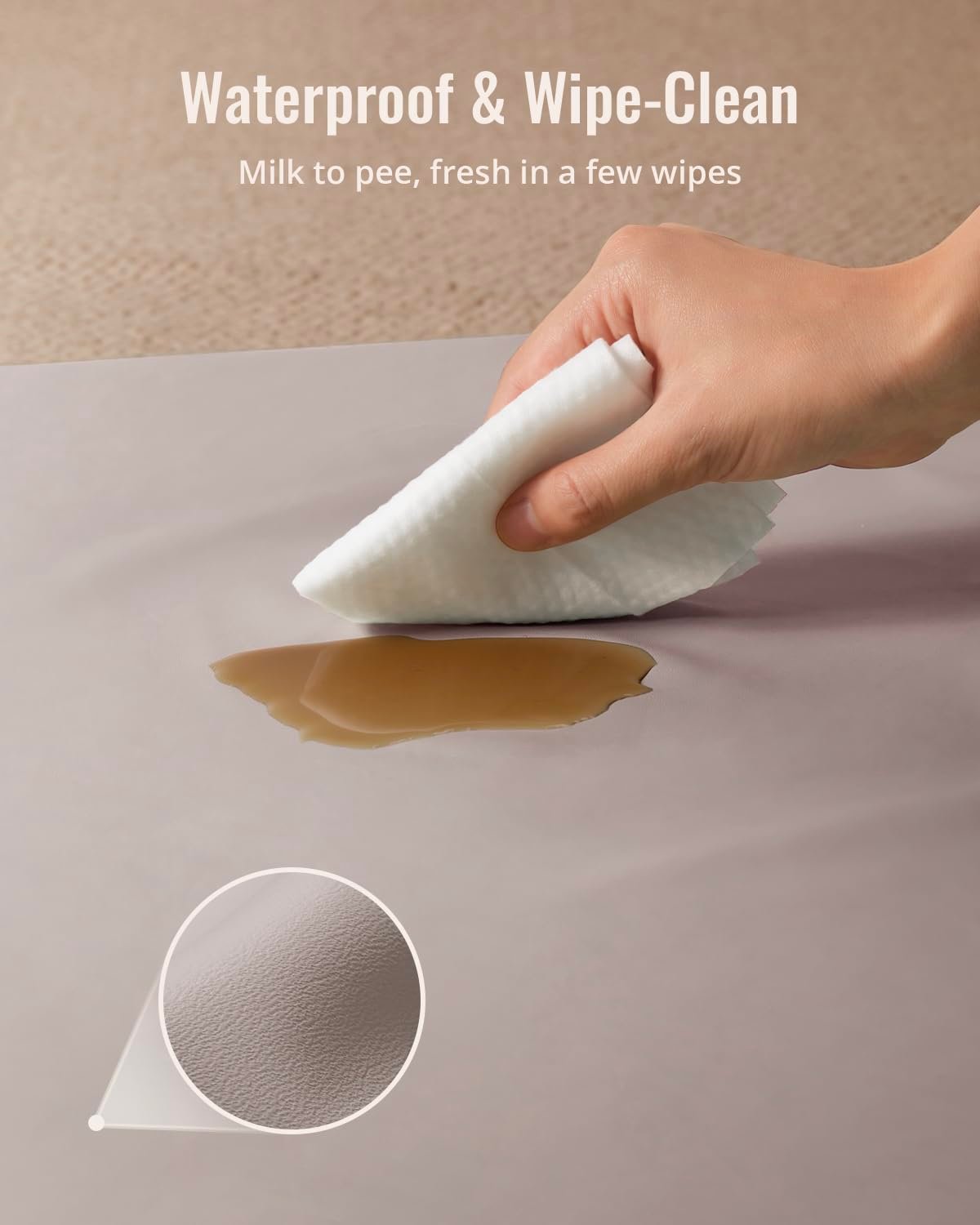 Waterproof & Easy to Clean: Unlike many other mats that absorb spills, this Vegan leather baby play mat is 100% waterproof, making it effortless to clean. Just wipe it down with a damp cloth to remove food, milk spills, or any other mess, keeping your baby’s play area spotless and hygienic