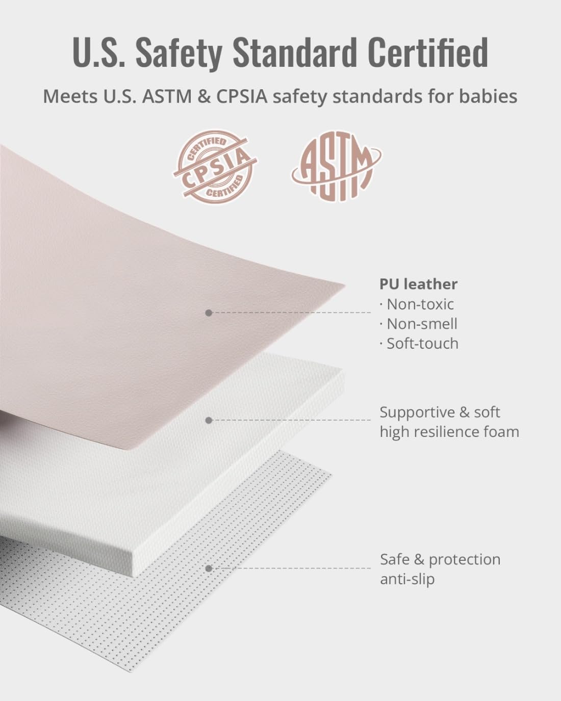 Prioritizing Baby’s Safety: Crafted from premium vegan leather that’s no harmful chemicals like PVC, phthalates, or toxins. Safety tested to meet CPSC standards for babies and children.Provide a safe space for your baby to explore, play, tummy time