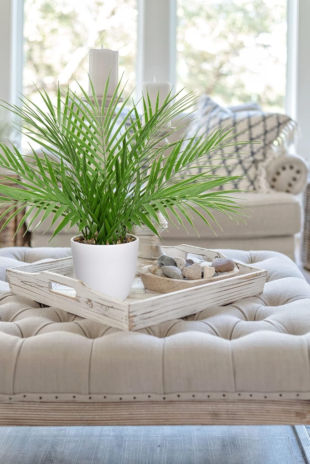 HIGH-QUALITY MATERIALS: Artificial palm plants are made of PE soft rubber, with realistic appearance, the white pots are made of matte plastic, so you can put it on bathroom. This Artificial Potted Greenery features palm fern in varying green shades, Slight dust gives them a soft and realistic look.