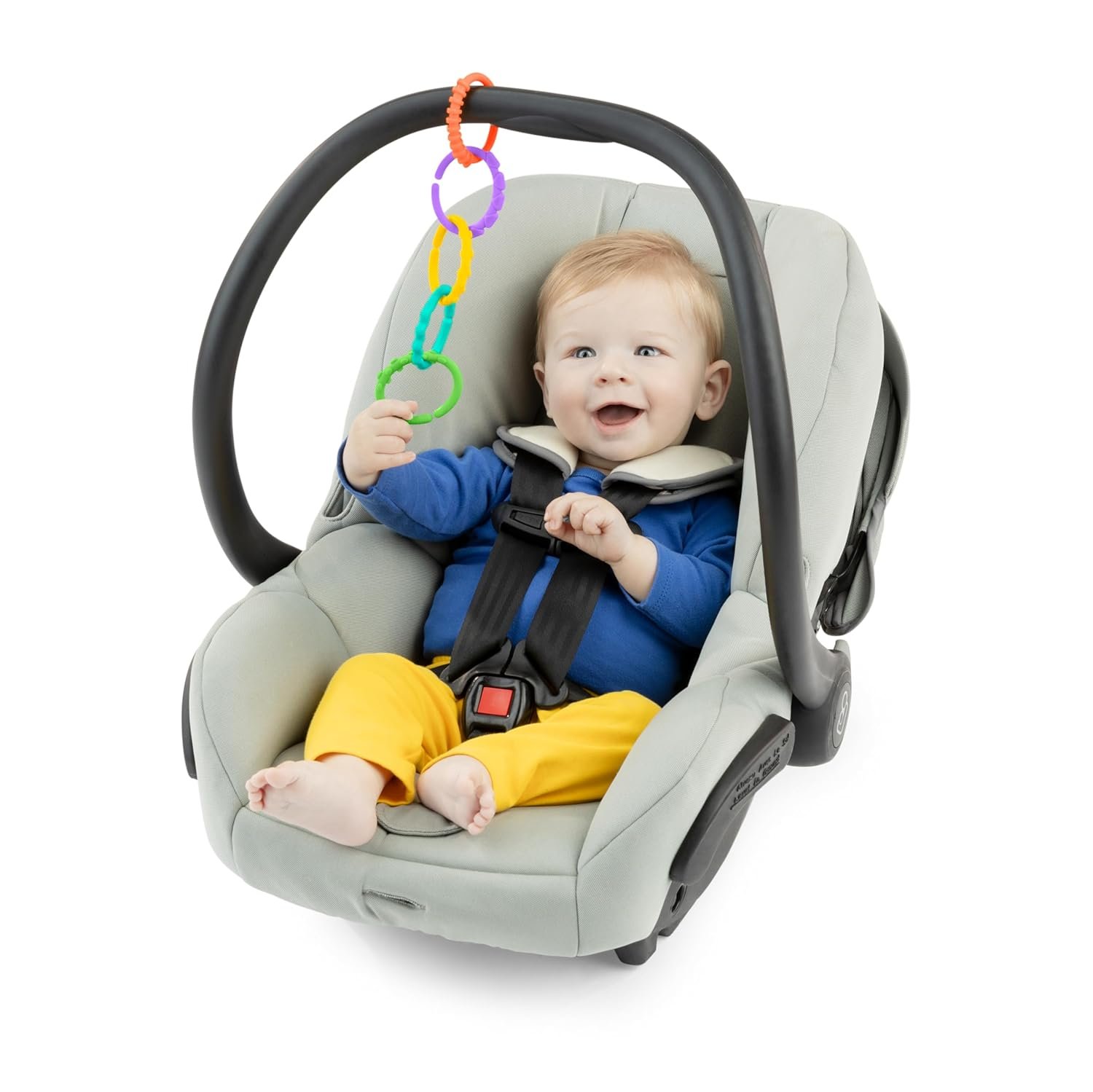 Customers find this toy to be a great first toy that’s worth its price, particularly appreciating its versatility for attaching various items to strollers, car seats, and cribs. They like the color variety, with one customer noting there are four links in each color, and find it perfect for babies, especially during the teething stage when they start grabbing things. While the links are useful for connecting toys, customers report that they fall apart easily.