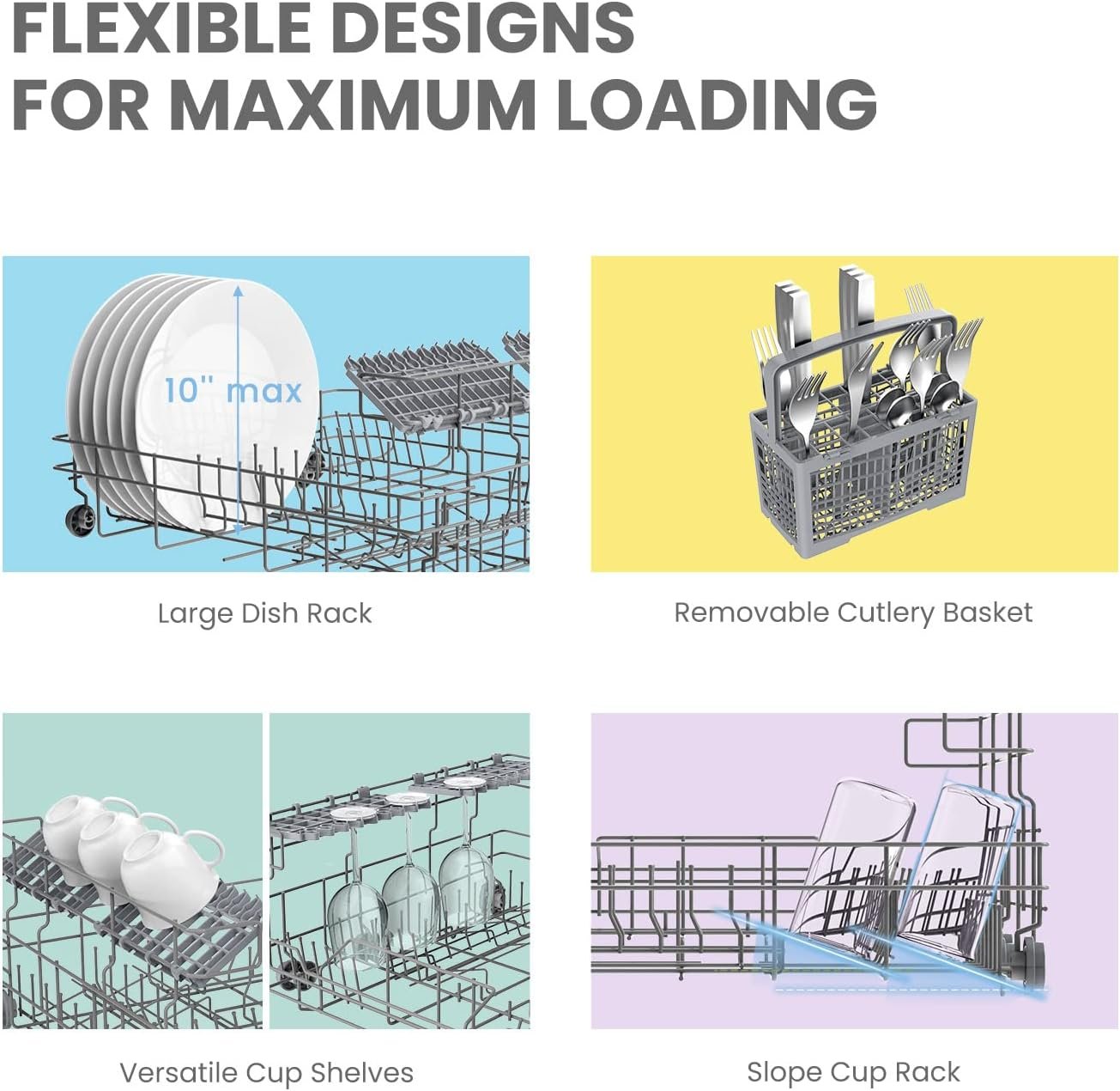 Speed Program- Only takes you 45 minutes to get all dishes cleaned, perfect for hurry-up situations, like holding a multi-round party. Accompanied with compliant, water consumption can be as low as 2.77 gallons of water, which greatly saves your costs.