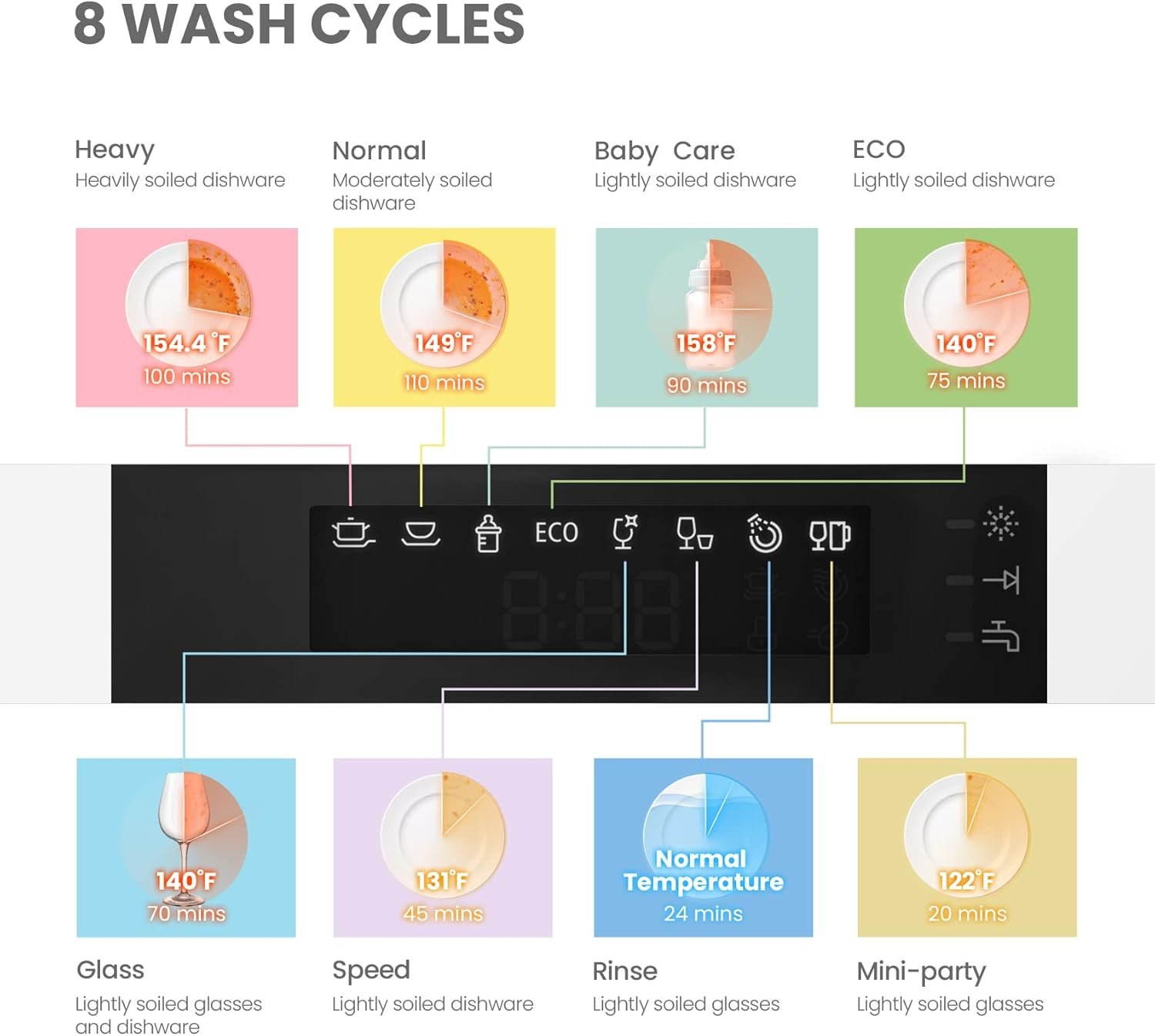 8 Washing Cycles- Most of the cleaning cycles, including Heavy, Normal, Baby-Care, ECO, Glass, and Speed, helped with extra-drying function, and deliver sparklingly cleaned and dried dishes. Three more cleaning options, including Speed, Mini-party, and Rinse, are designed for COMFEE’ compact dishwasher, providing high flexibility for you to choose in different situations.