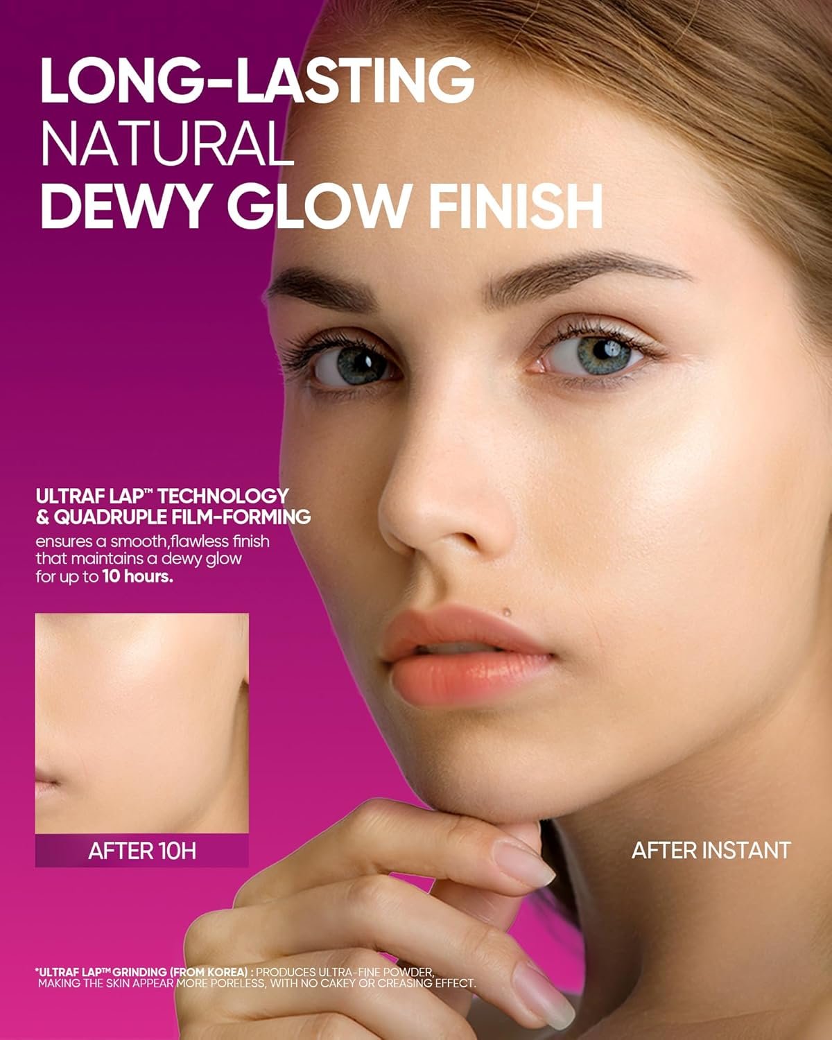 [NATURAL DEWY GLOW FINISH] Provides an instant glowing effect with Ultraf Lap technology, offering ultra-fine powders that feel silky smooth like milk. It adheres to the skin, making pores invisible, while delivering a crystal-clear, natural dewy glow.