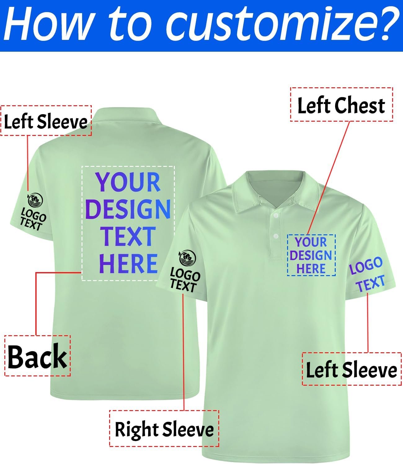 Click “Customize Now” to select the size and color of the polo shirtDesign your own personalized polo shirt by adding pictures, logos, names or textFront & Back & Sleeve