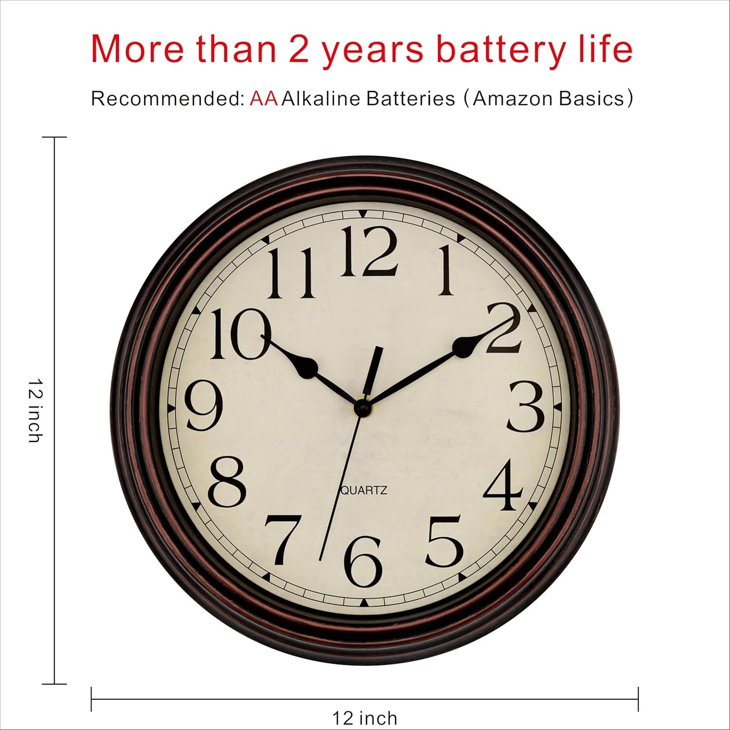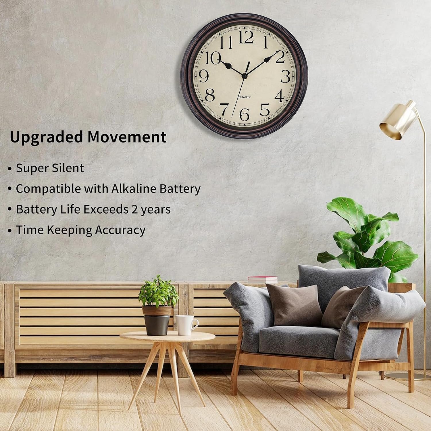 Upgraded Movement: Compatible with alkaline battery, with a battery life of over 2 years ( tested under AA Alkaline High Performance Batteries 1.5) . Requires 1 AA Battery for the clock (not included). Please note that actual battery life depending on the battery’s capacity, environmental conditions, and usage habits.