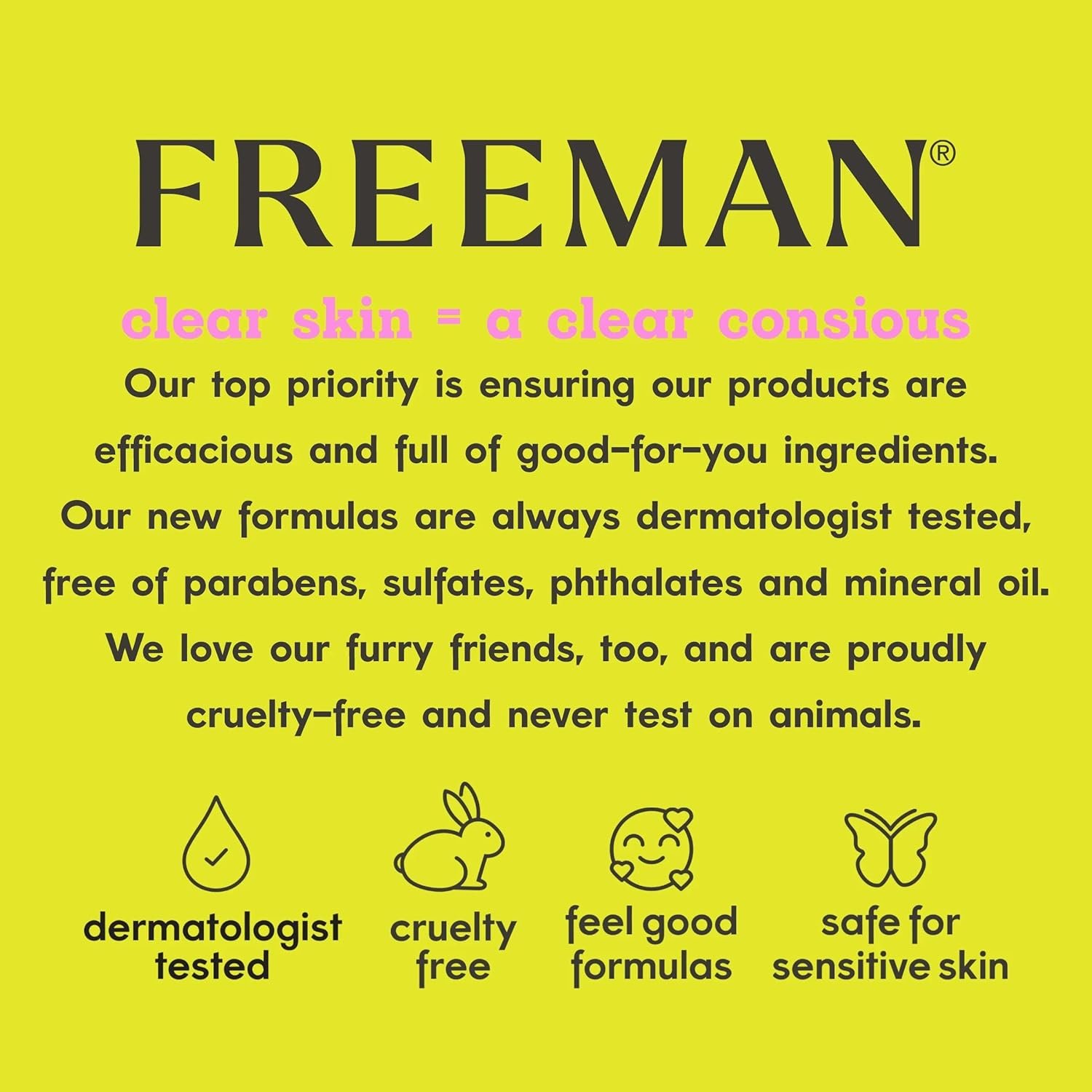 Made with clean ingredients free of parabens, sulfates, silicone, phthalates, and mineral oils. We aim to provide quality, affordable skincare- No harsh chemicals & 100% Cruelty Free and Vegan – Freeman products are never tested on animals