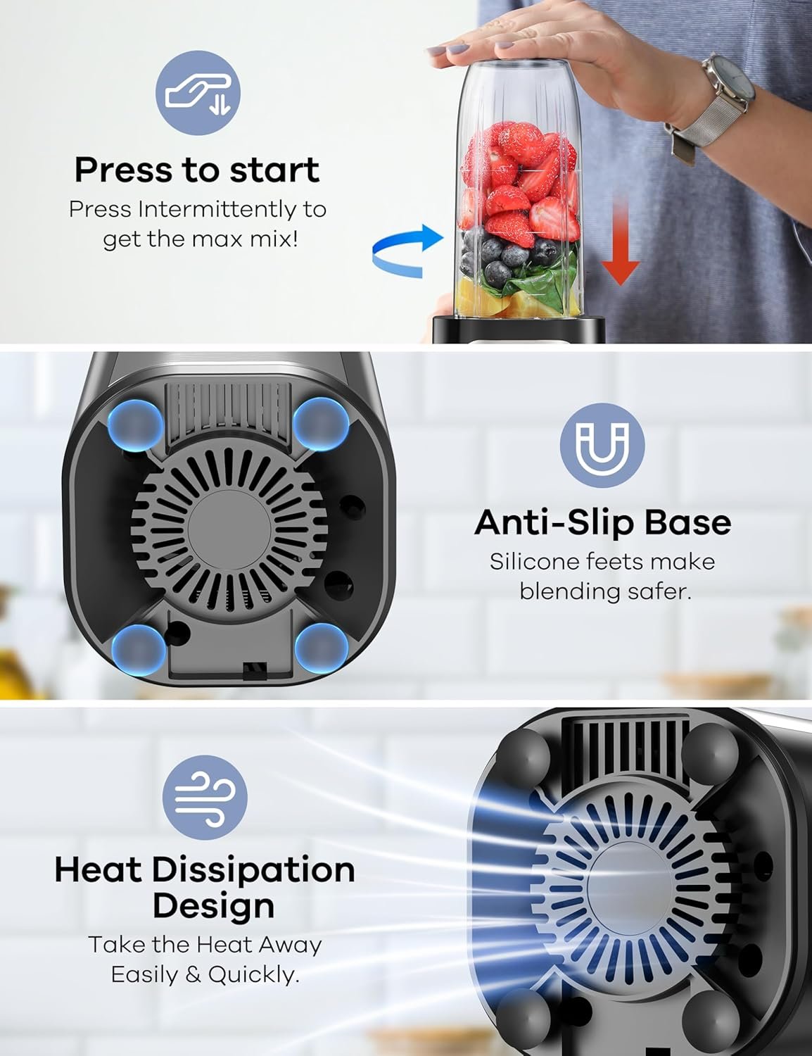 EASY TO CLEAN: the electric smoothies blender only works when the mixing cup is properly pressed down; Cooling fan on the bottom and the back dissipates heat quickly; Four non-slip silicone pads keep the food blender balanced while working; Cups and lids are dishwasher-safe.