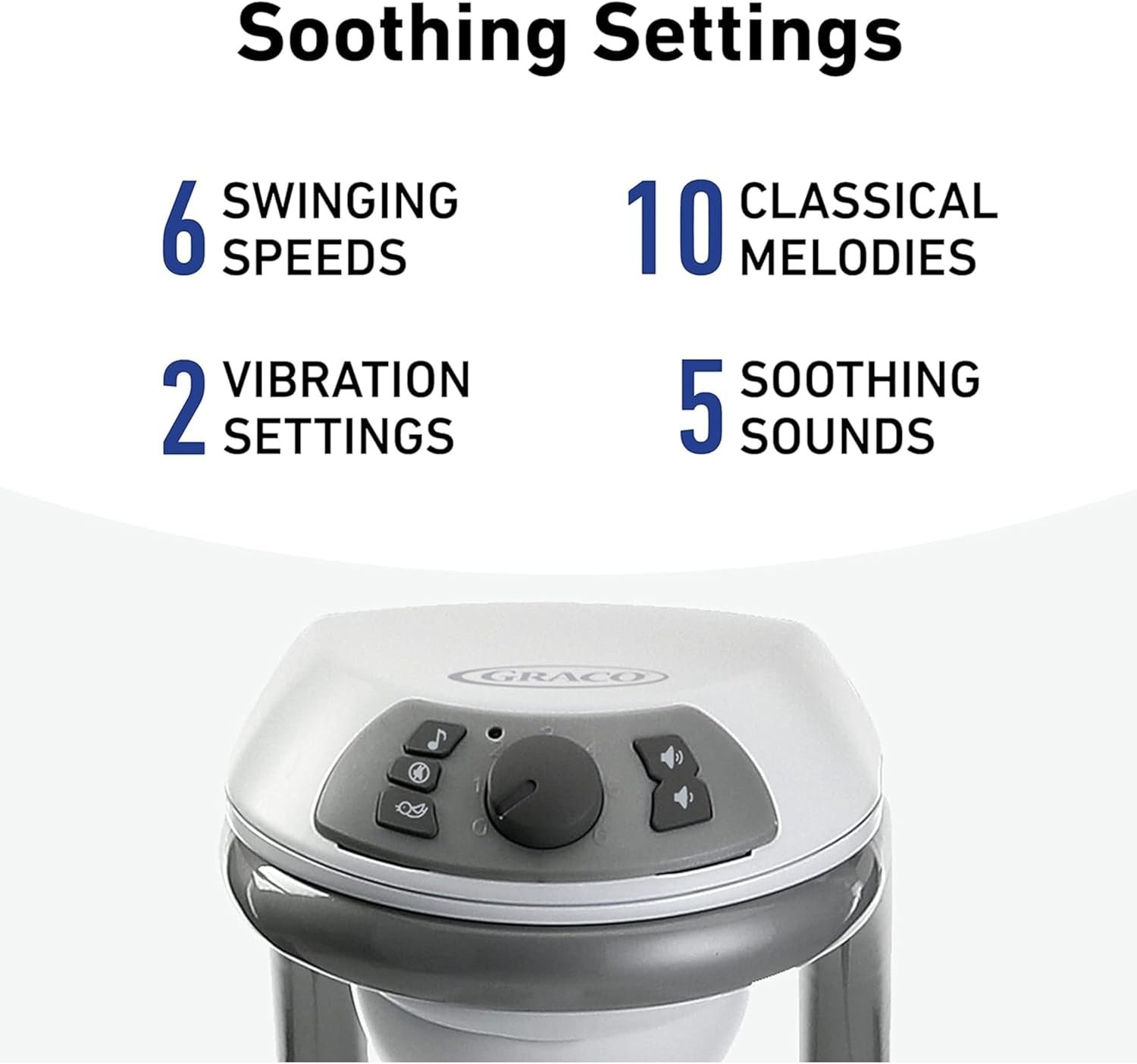 6 swinging speeds allow you to find the right pace; 2-speed vibration helps to soothe baby; 10 classic melodies and 5 nature sounds to delight and amuse; Mobile with 3 soft toys keeps baby entertained