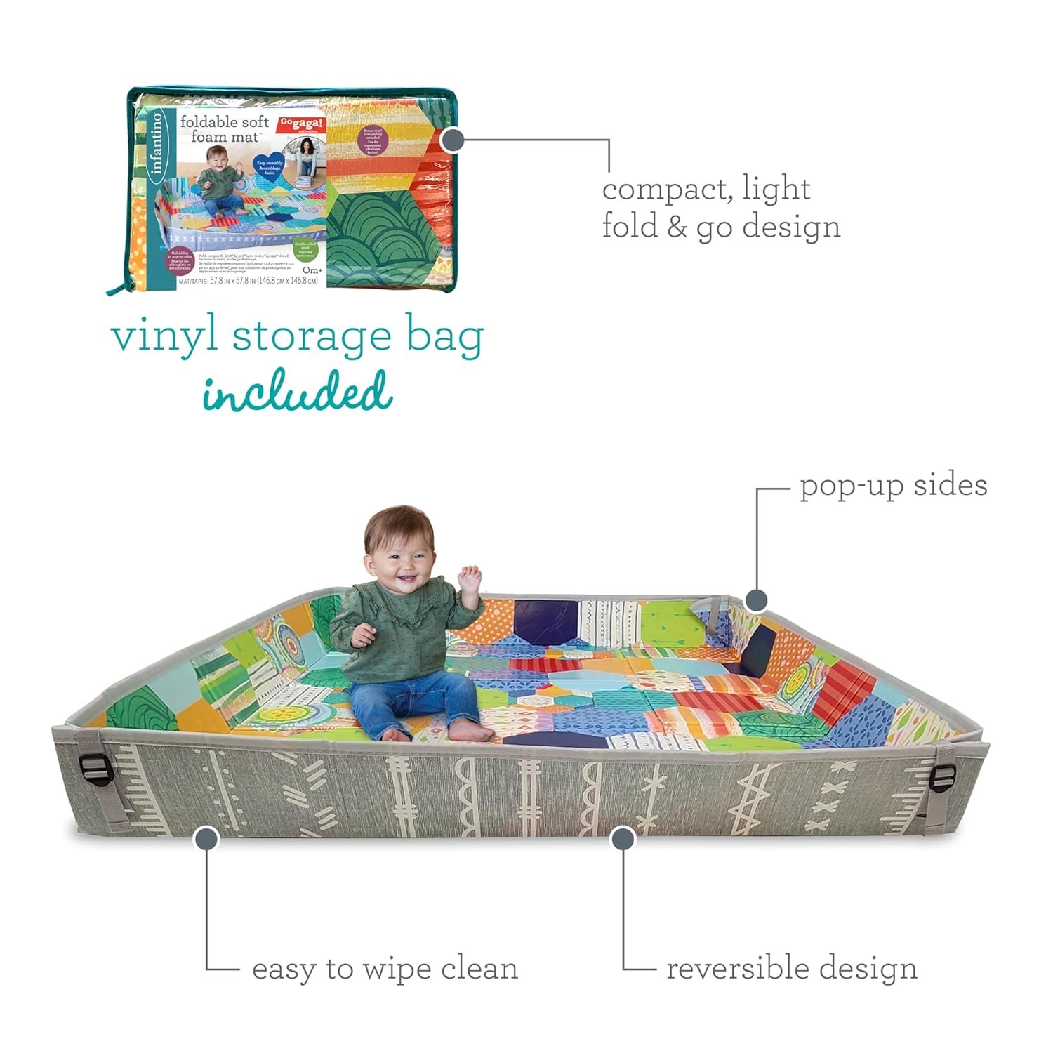 The Infantino Foldable Soft Foam Mat gives your baby a soft, supportive place to play, explore, and grow – wherever you are. Use it flat as a baby tummy time mat or pop up the four soft sides to create a secure baby floor mat that keeps toys from rolling away. It’s perfect for little ones learning to roll, crawl, or sit – making it an ideal playmat for babies 0-6 months and beyond. With a reversible design, you get two stylish looks in one: a bright, boho-inspired pattern to capture baby’s attention, and a soft, neutral tone that blends easily into any room – ideal for shared spaces. The soft foam surface wipes clean in seconds, and the lightweight foldable foam mat design makes it easy to store or take on the go. Whether at home or away, this playmat for babies 0-12 months is a baby registry essential and the flexible foundation for everyday play.