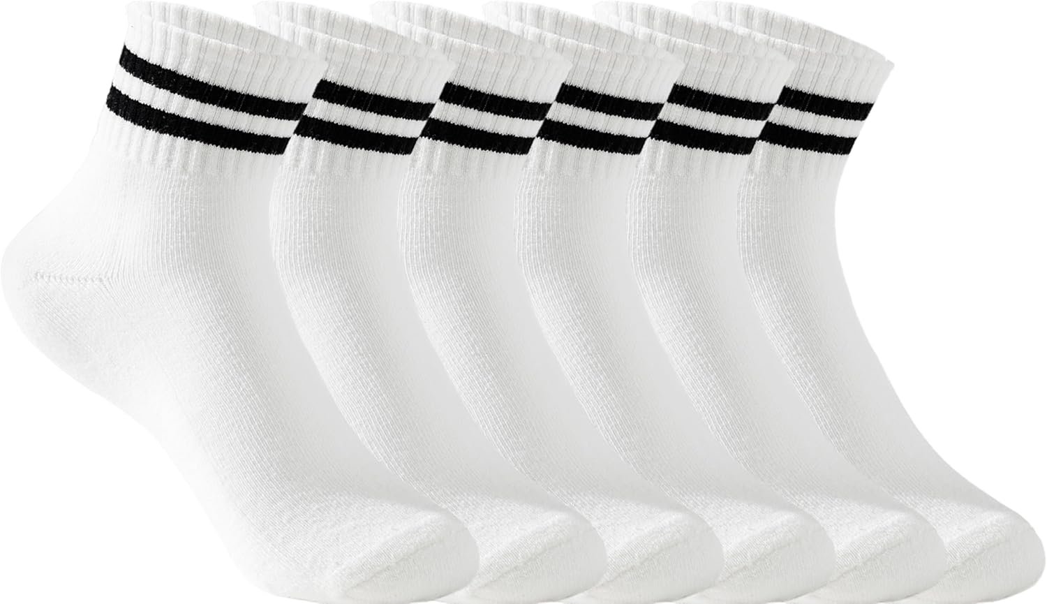Customers find these socks to be a perfect crew style with a retro vibe thanks to the stripes, and appreciate their comfort, with one noting there’s no uncomfortable seam on the toes. They are moderately thick, generously cushioned, and have a perfect height on the ankle. The durability receives mixed feedback – while some say they hold up well, others report holes forming in the heel after one wear.