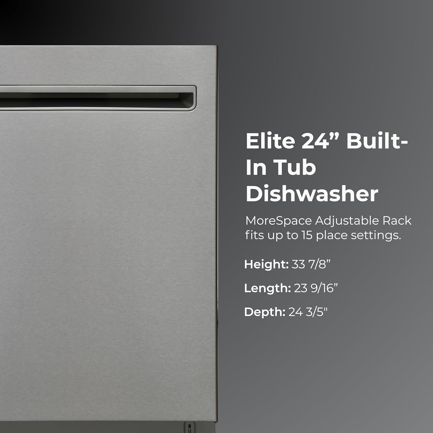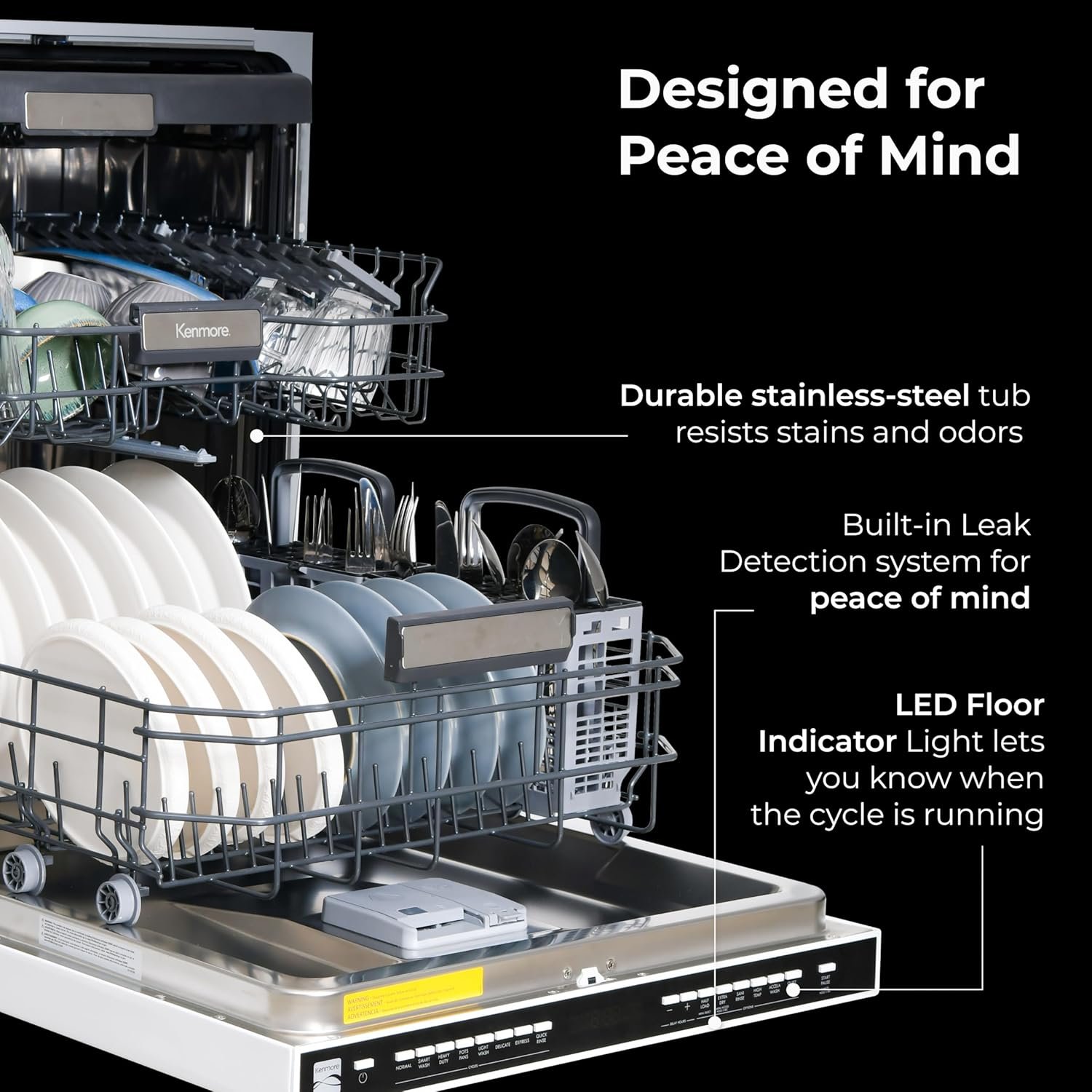 The Kenmore 24″ Built-In White Dishwasher delivers ultra-quiet performance and modern design for busy nights and delicate dishes. UltraWash Plus uses three spray arms and filtered water to power through stuck-on food. The SmartWash Cycle detects soil levels in the water and automatically adjusts the temperature, pressure, and cycle time for a deep, efficient clean every time. TurboDry uses hot air circulation and a heating element to remove moisture from every load, while the Extra Dry and Express Cycles give you cabinet-ready results faster. The TurboFlex Third Rack adds 35 percent more loading space for long utensils, tools, and flatware, and slides aside to make room for tall items below. The MoreSpace Plus Adjustable Rack shifts between three heights, even when fully loaded, so you can customize the interior for everything from oversized pots to delicate stemware. The stainless steel tub resists stains and retains heat to help improve drying performance with every cycle. Built-in LED interior lighting makes it easy to see inside, and a green floor light shows when the cycle is running. Hidden light-touch controls and a clean white finish complete the look. This dishwasher fits up to 15 place settings and includes a removable wine glass holder for added peace of mind when washing stemware. ENERGY STAR Certified and operating at just 42 dBA, it offers a powerful clean that runs quietly in the background. Built-in Leak Detection helps protect your home by monitoring water flow and automatically draining if a problem is detected.
