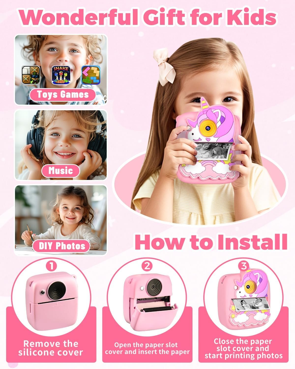 【Multifunctional Kids Digital Camera】This instant print camera for kids also as a digital camera.With functions of instant print, capture colorful pictures and HD 1080p videos, Music player, 8X, flash, time-lapse, continuous shooting, puzzle games ect., More creative playing with multiple frames, color filters and mirror effects, inspiring their sense of creativity, kids will enjoy being a photographer.