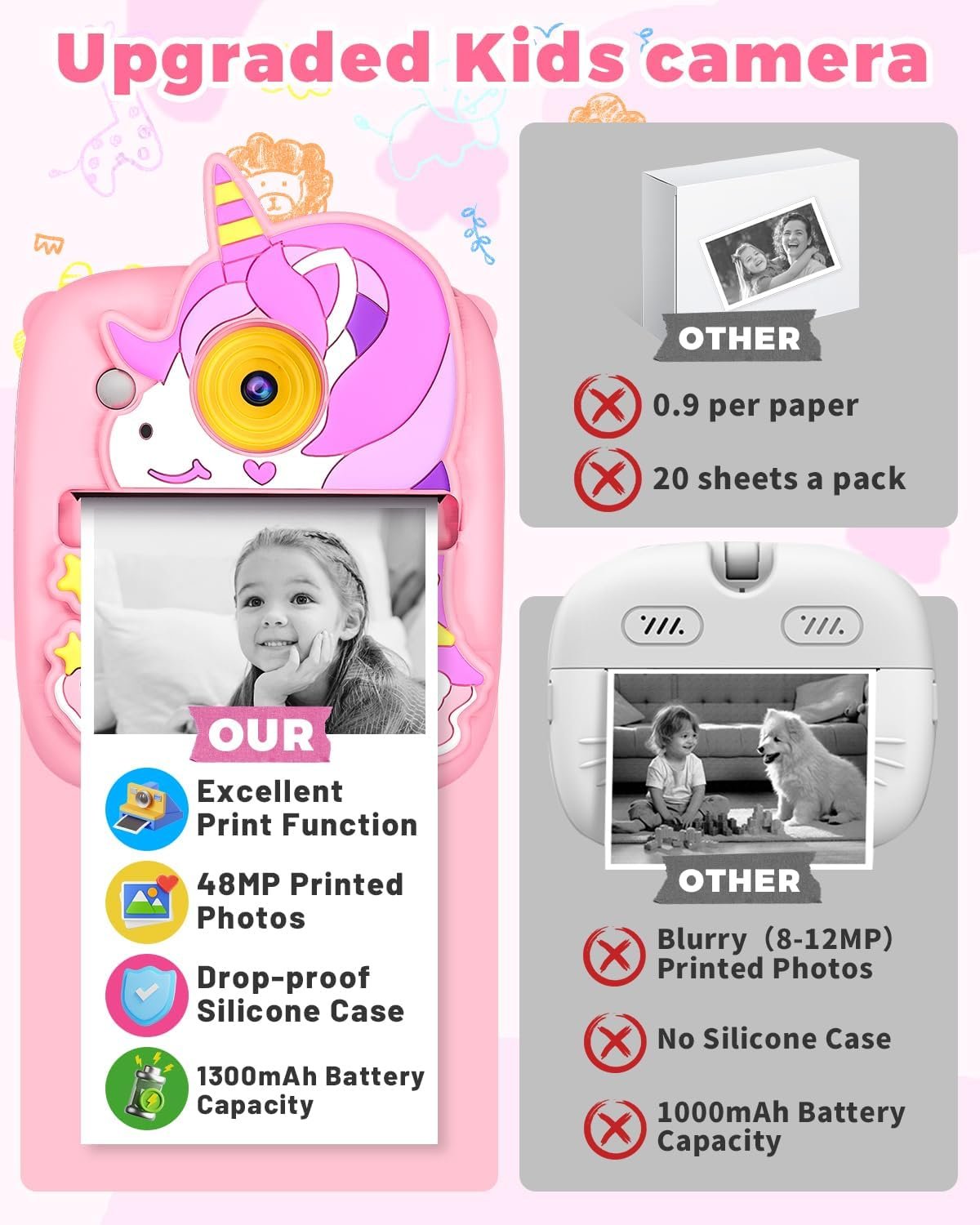 【48 MEGA PIXELS & 1080P HD VIDEO】This kids printing camera boasting 48M HD pixels paired with 1080P resolution for vivid photo and video recording. Compared with other instant print cameras which only have 8-12MP, it‘s greatly improved the clarity of photos. 2.0 inch IPS screen camera providing children better color display. Capture every moment in vibrant detail with 1080P high-definition photography. Let your little one creativity shine with our kids camera.