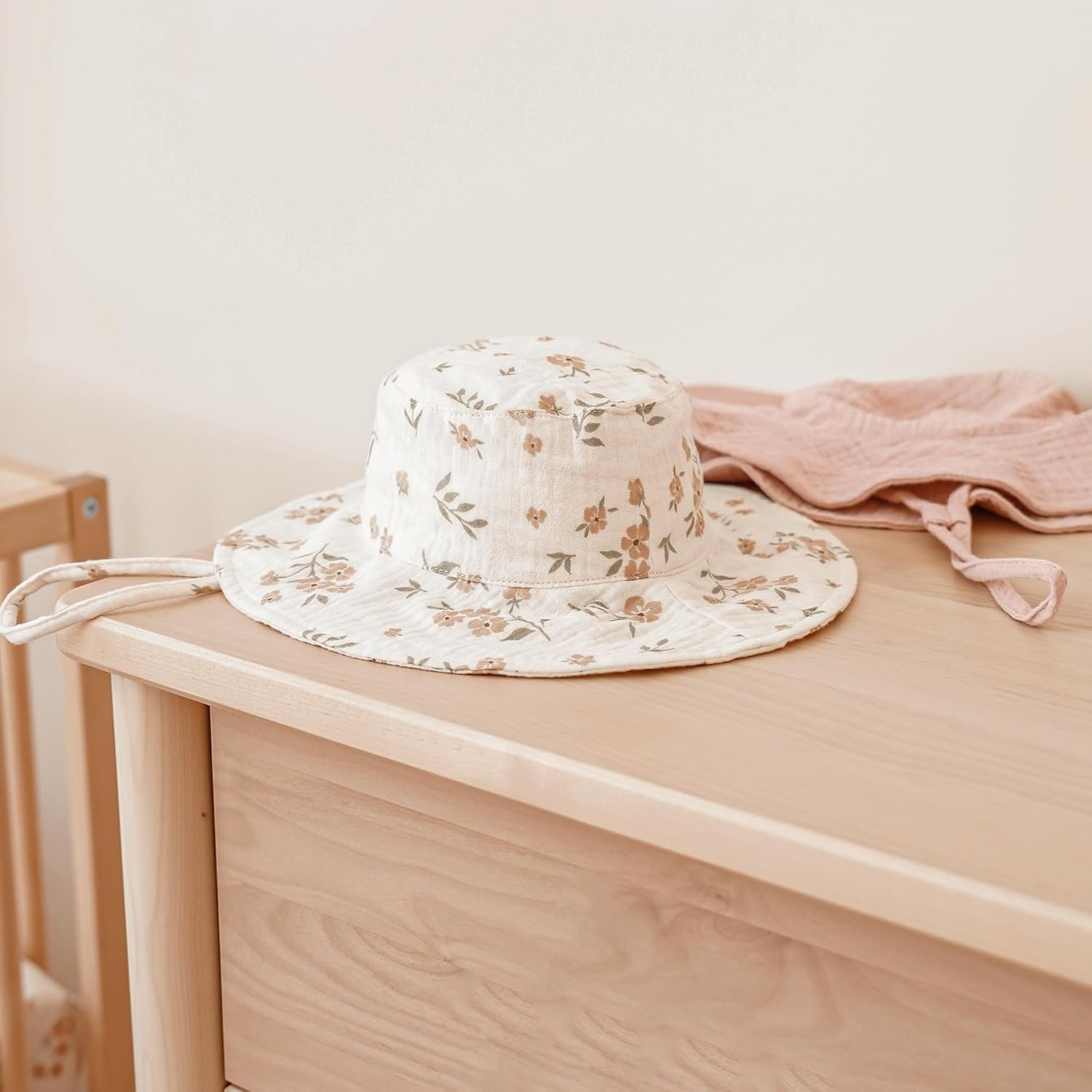 Baby sun hat is made from muslin fabric with a polyester lining, providing UPF 50+ UV protection.
