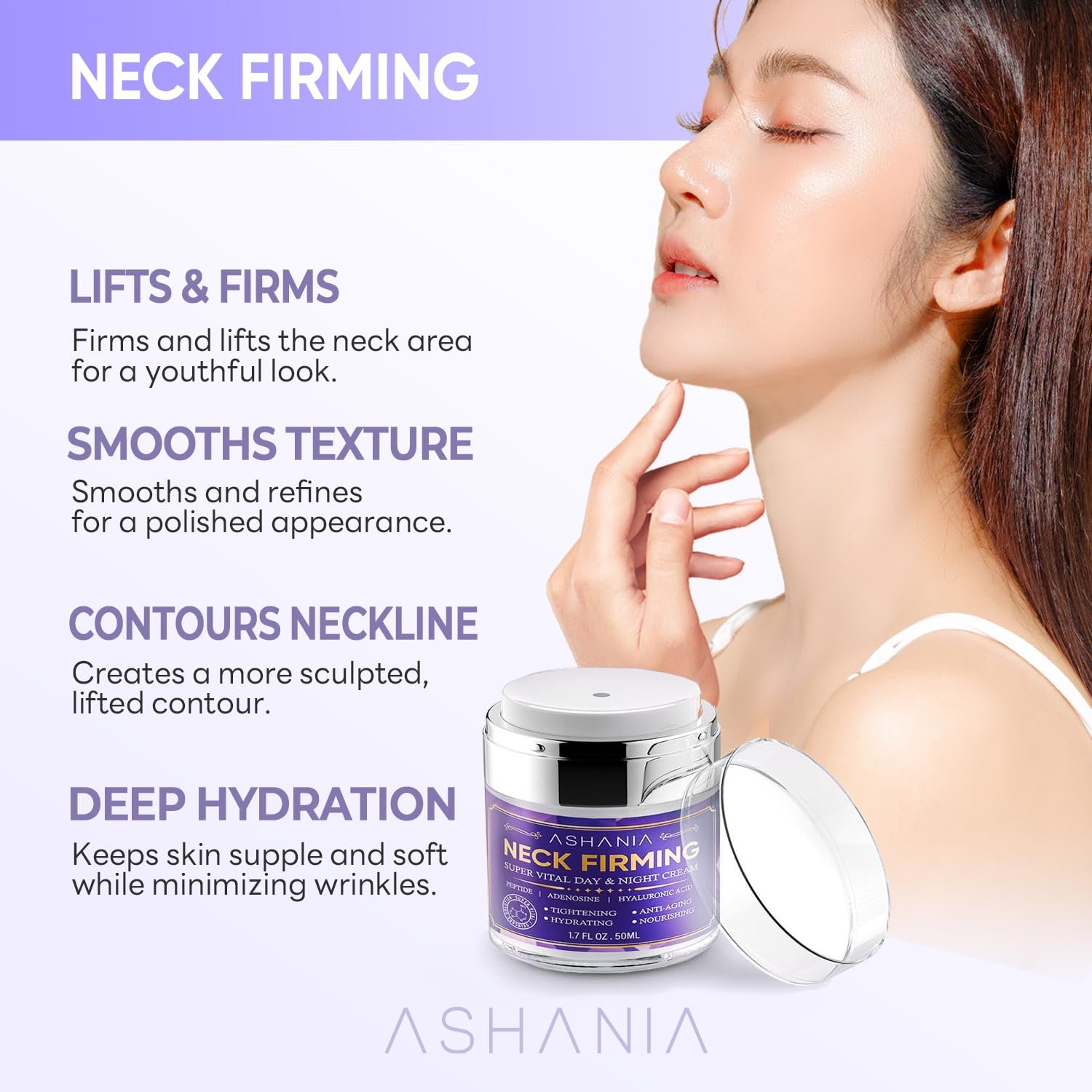 [DEEP HYDRATION & ELASTICITY SUPPORT]: Hyaluronic Acid provides long-lasting hydration while Adenosine and peptides help improve elasticity and support collagen for a plumper, revitalized neck & décolleté.