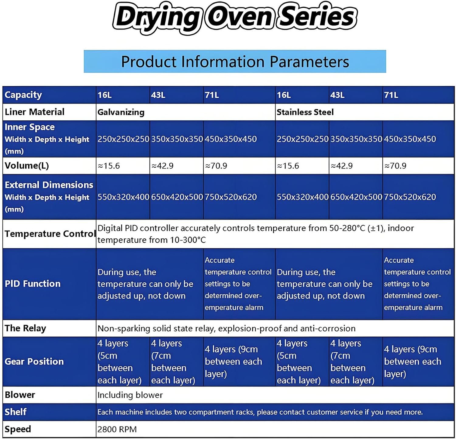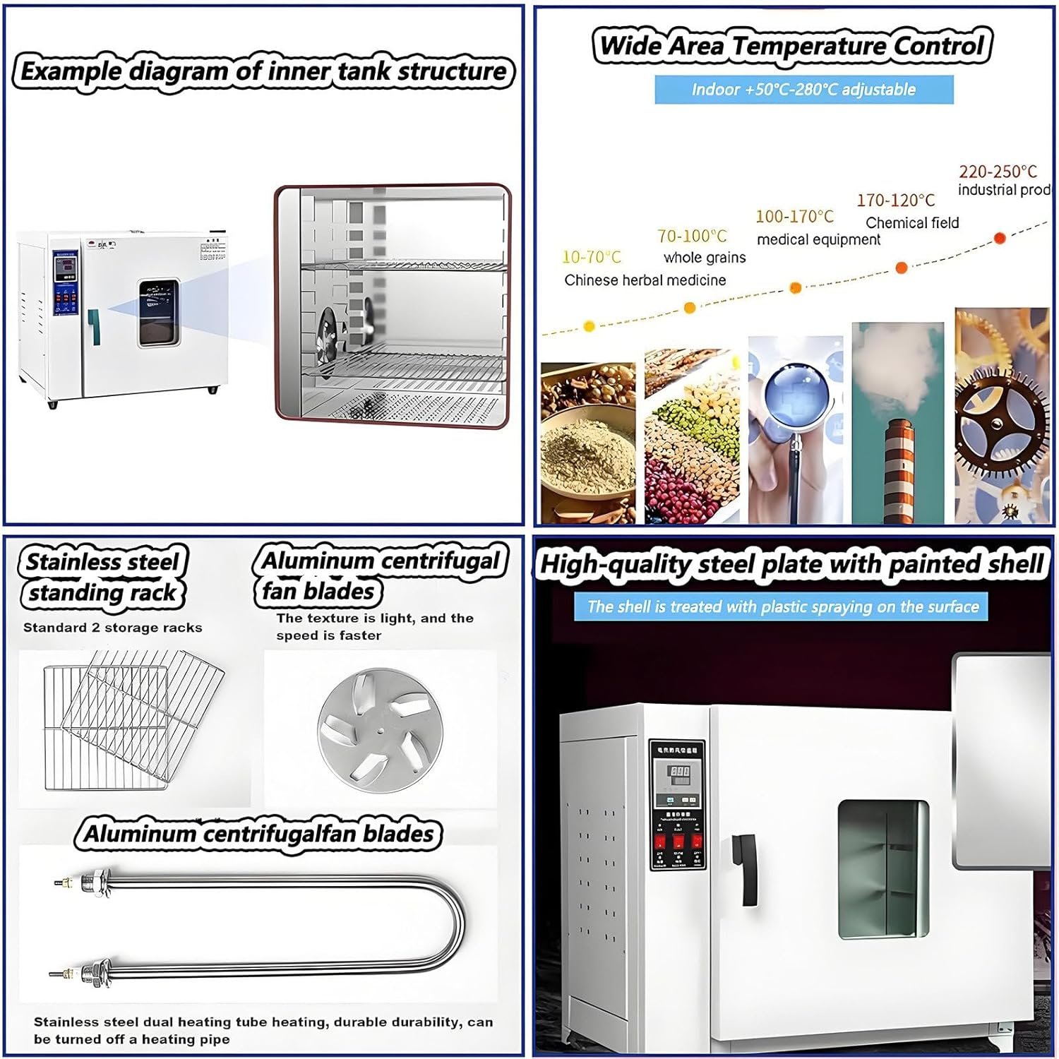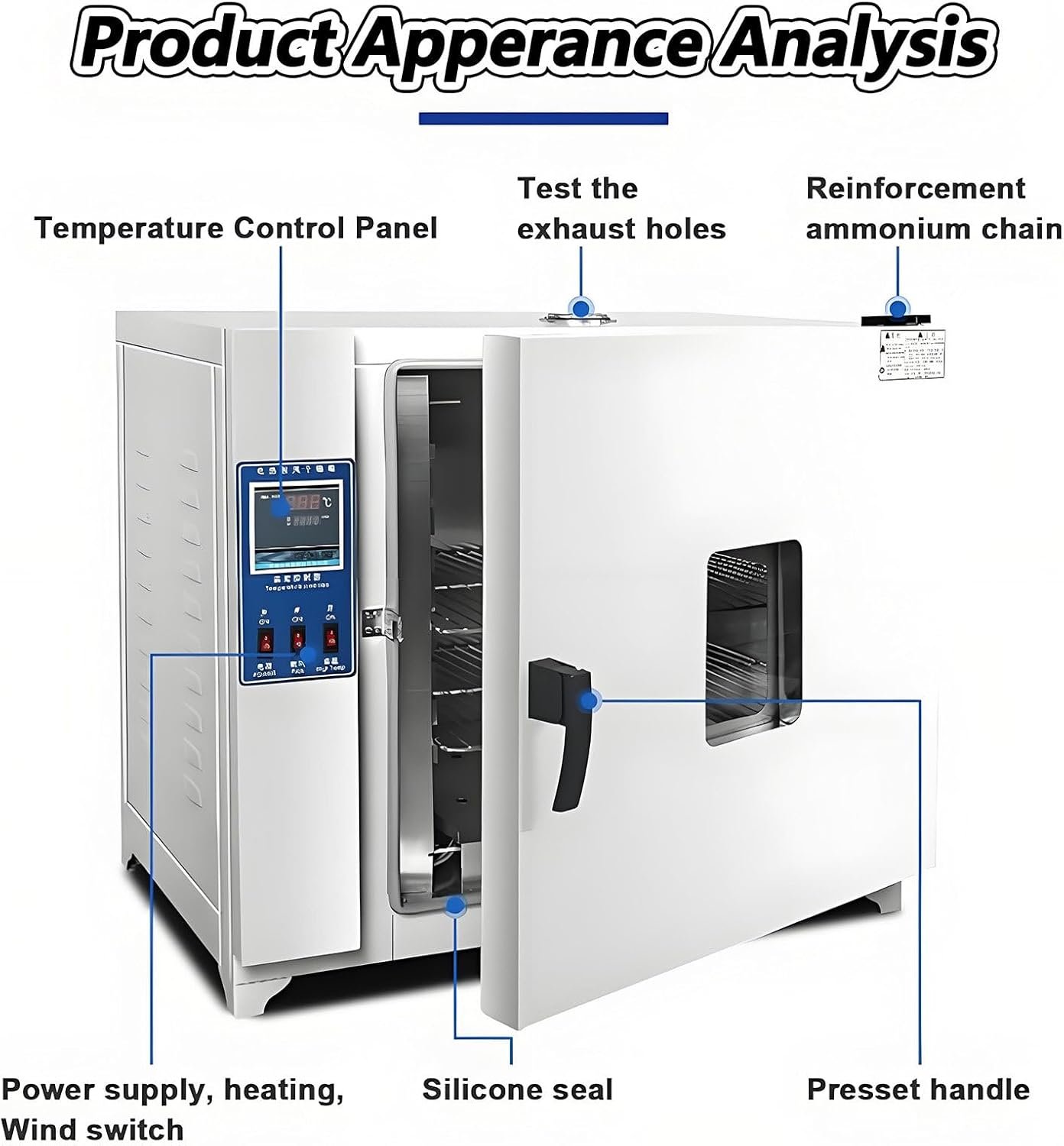 ●【High Quality Materials】Electric Heating Constant Temperature Blast Drying Oven is made of high-quality galvanized sheet, and the exterior is made of electrostatic sprayed shell, which has high corrosion resistance. It has functions such as over-temperature alarm, self-tuning, and temperature calibration timing.