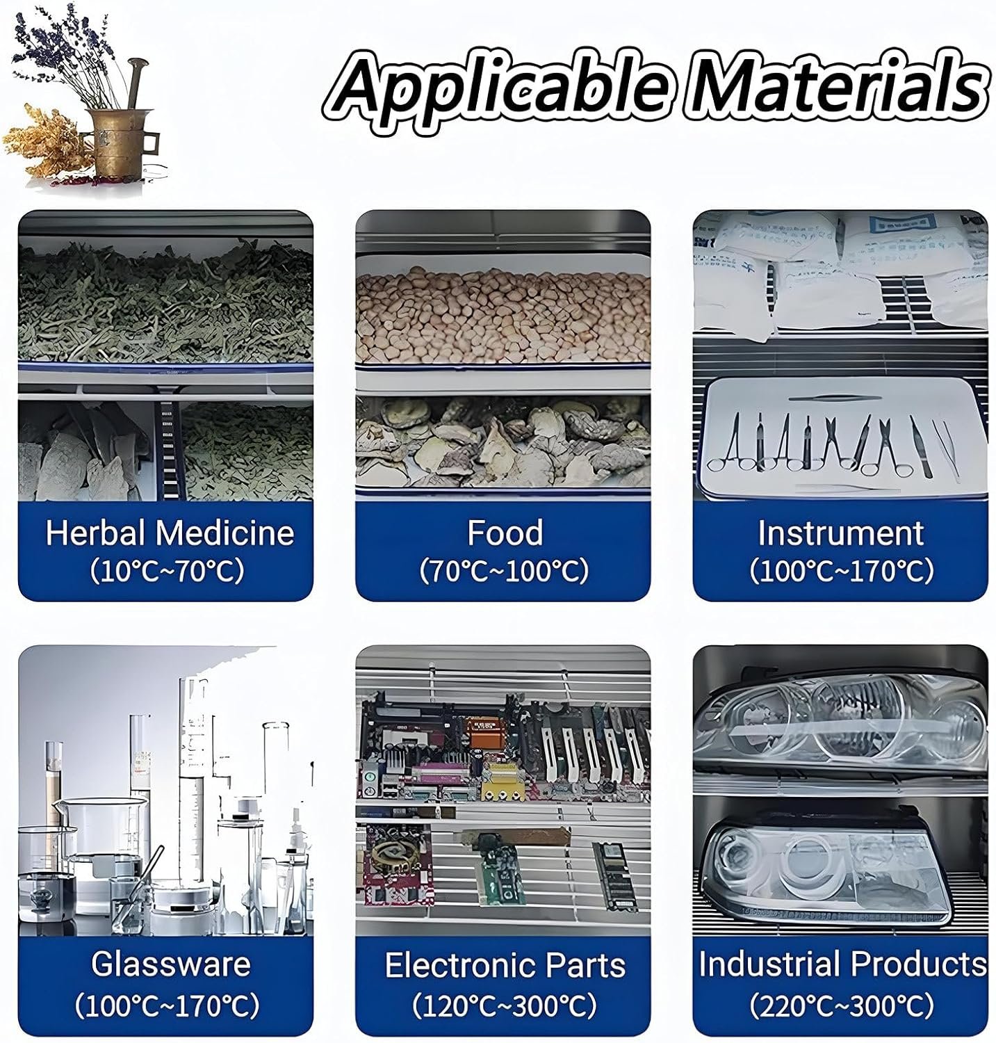 ●【Application】Our digital drying ovens feature a two-speed design for energy efficiency, a thick insulation layer to reduce heat loss, and increased insulation performance to lower machine power consumption. Widely used in laboratory test drying, heat treatment, and industrial and agricultural heating, our ovens are for scientific research, medical facilities, and health institutions.
