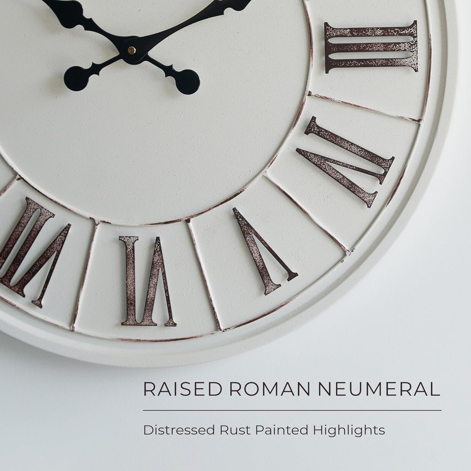 Product Features: The Wall Clock Featuring rustic white metal face and roman numeral with pale rust red highlights, subtle distressed hand carfted item. Combination of farmhouse and modern feel, and can be incorporated into almost any living room decor style. It work with any colored wall, and pair with other decor items seamlessly!