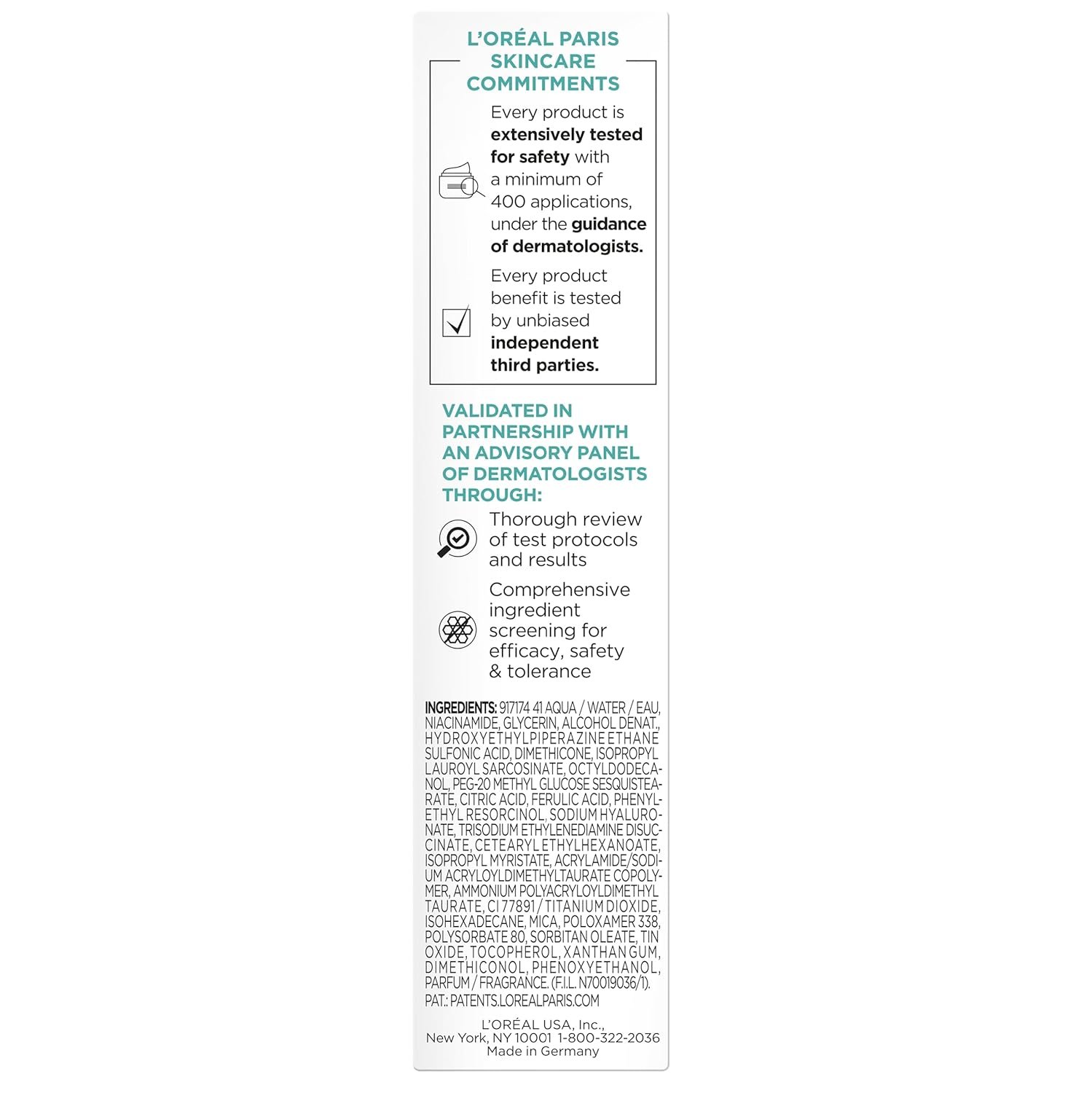 Looking to visibly fade dark spots, post-acne marks, and imperfections? Discover our NEW L’Oreal Paris Bright Reveal 12 percent Niacinamide plus Amino Sulfonic plus Ferulic Dark Spot Serum. Visibly fade dark spots by up to -40%. In a 12-week clinical study on dark spots [age spots, sun spots and post acne marks.] Niacinamide Serum Clinical Study. 2022. This dark spot serum will visibly reduce the appearance of all types of dark spots, including sun and age spots, as well as post-acne marks. Helps prevent aging signs when used as directed with other sun protection measures. Visibly fades all types of dark spots in a 12-week clinical study on dark spots [age spots, sun spots, and post-acne marks]; Niacinamide Serum Clinical Study, conducted by a third party partner (August, 2022). Visibly reduce the appearance and diminish the look of dark spots, when used as directed with other sun protection measures. Formulated with Niacinamide, a top dermatologist-recommended brightening ingredient, and antioxidant Ferulic Acid and Amino Sulfonic to help gently exfoliate skin surface cells. Light reflecting technology helps instantly reveal more luminous and fresher-looking skin. Allergy Tested, Paraben, Dye and Mineral Oil Free. Non-greasy. Dermatologist tested. Suitable for sensitive skin. For all skin types.