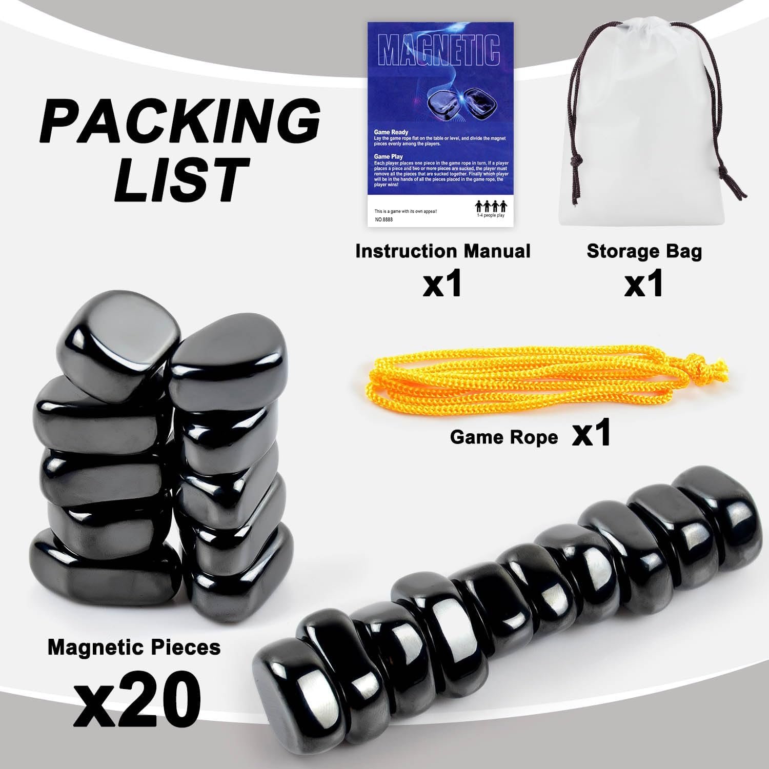 Great Gift: Our magnetic chess game is the perfect gift for children, teens and adults! Perfect for birthday gifts, Christmas gifts, holiday gifts! Packing List: Magnetic Blocks *20;Game Rope *1; Storage Bag *1;Instruction Manual *1
