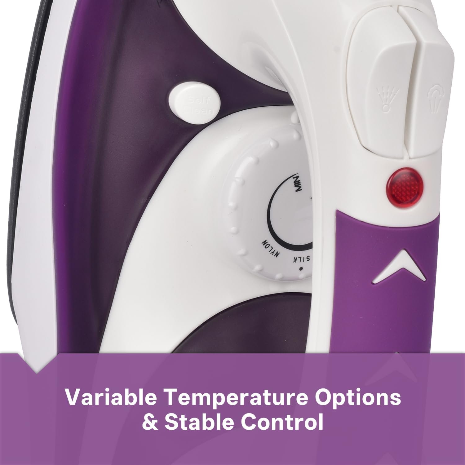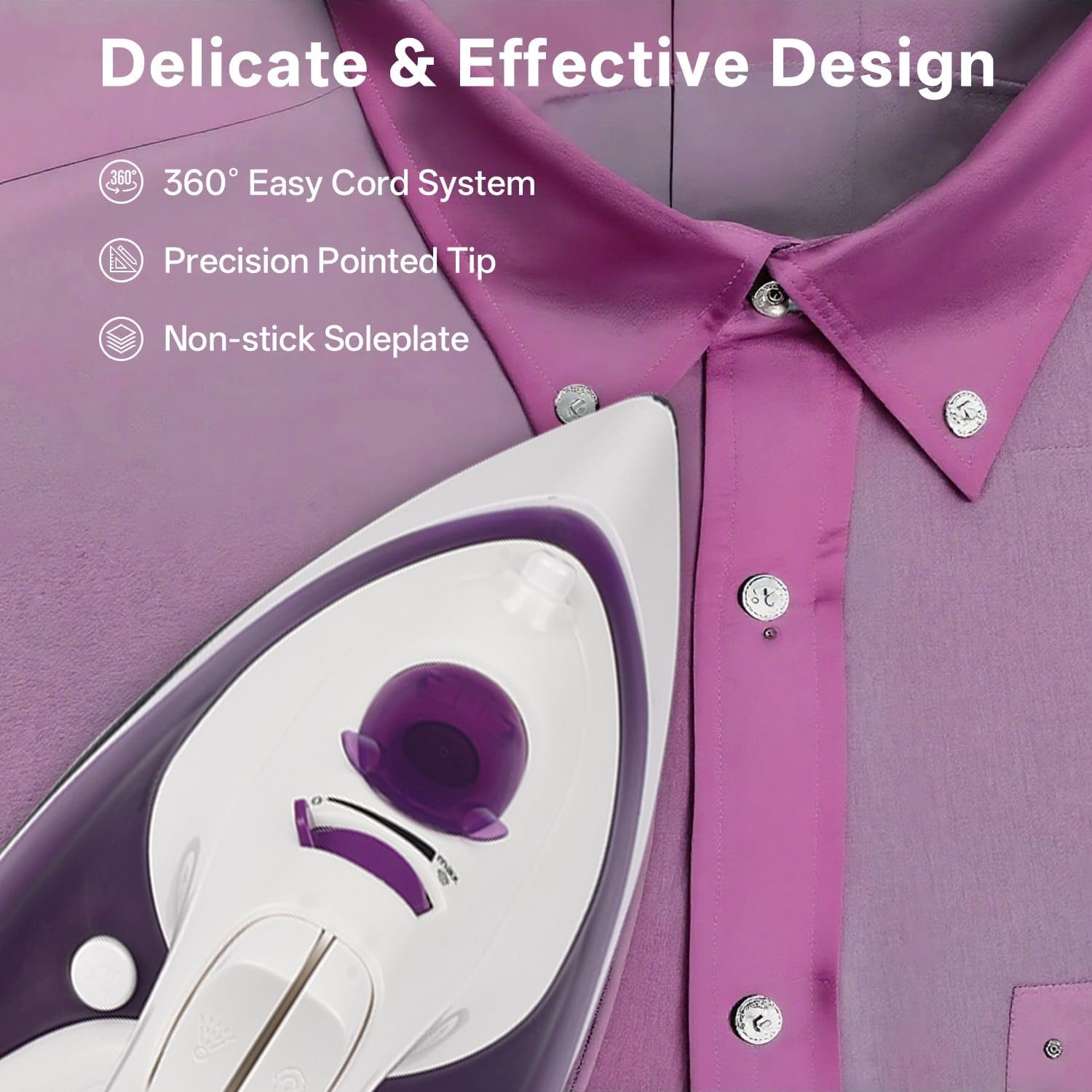 Premium Purple Design & Durability: Lab-tested for 10,000+ uses, its scratch-resistant purple finish fits stylish homes. Ergonomic handle with tipped point to the front makes clothes iron with steamer the most user friendly