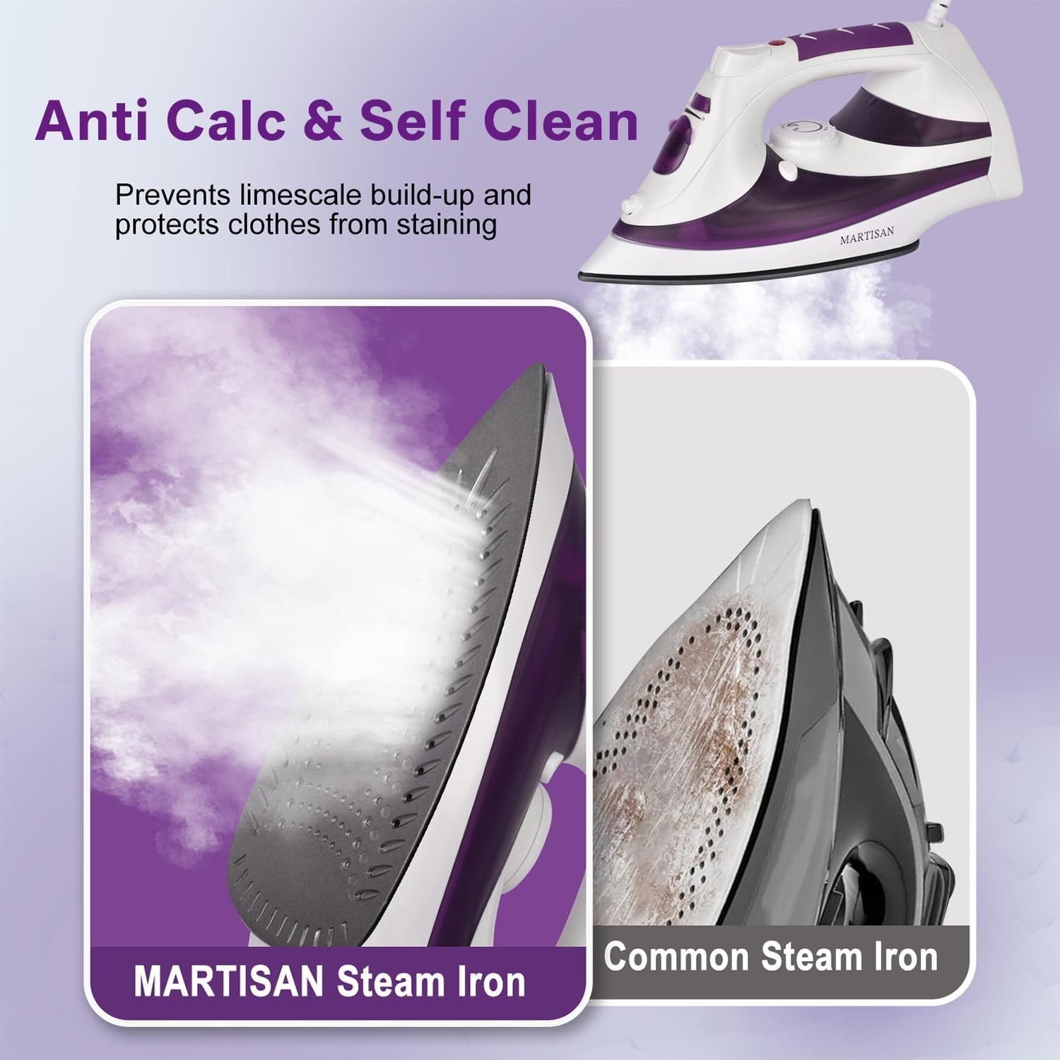 MARTISAN Steam Iron, New Version, Rapid Heating, Powerful Steam, Anti-Calc, Self-Cleaning, Smooth Non-stick Soleplate, Variable Temperature, Steam Burst, Grape Purple, 1200 Watts