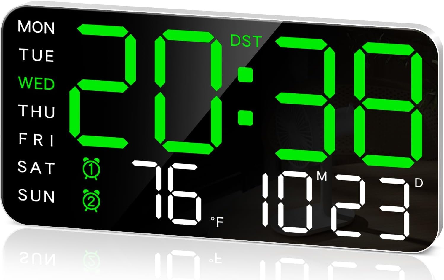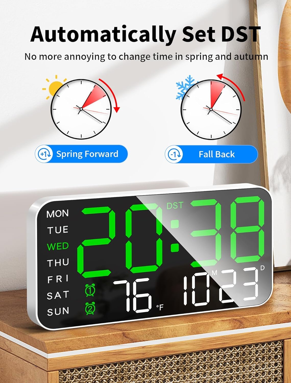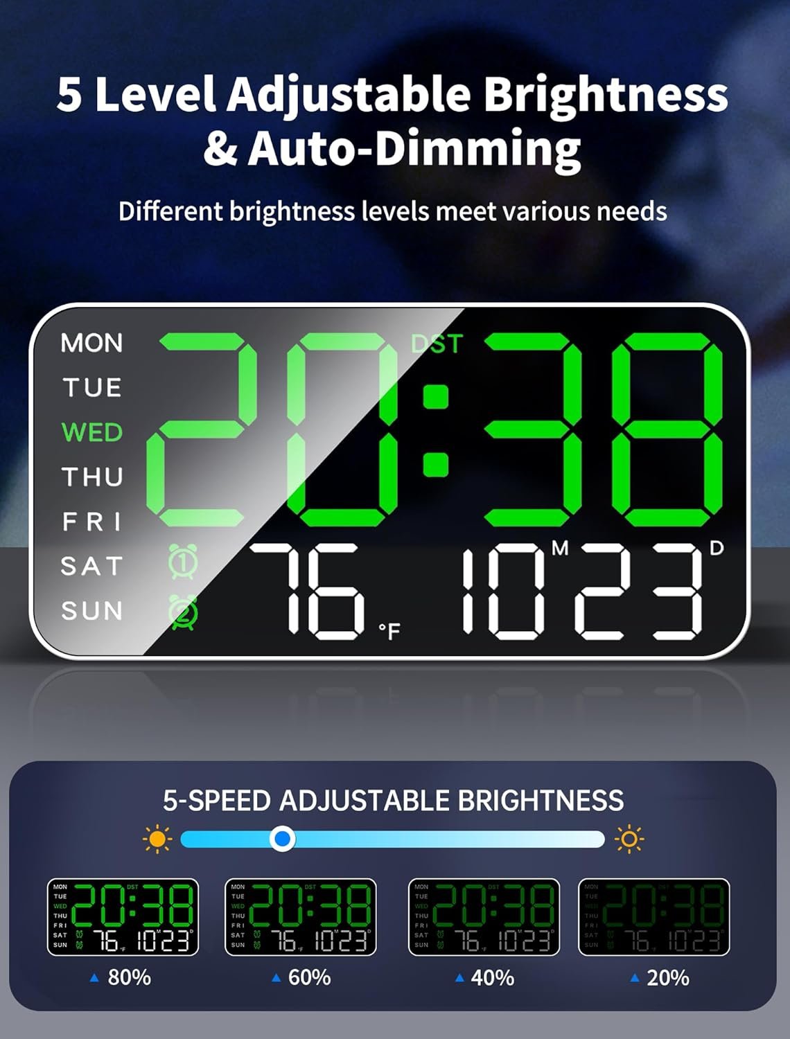 Automatic Daylight Saving Time and Auto/Manual Brightness: Seamlessly adjust to daylight saving time with a long press of the “-” button. Choose from 5 brightness levels using the remote control for personalized comfort, while the built-in automatic dimming sensor intelligently adapts to ambient lighting changes