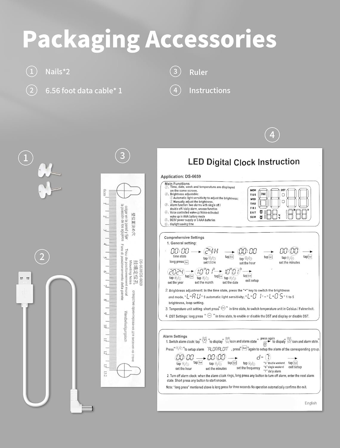 Digital Wall Clock, 6.56ft Power Cable,Nails,Product Manual