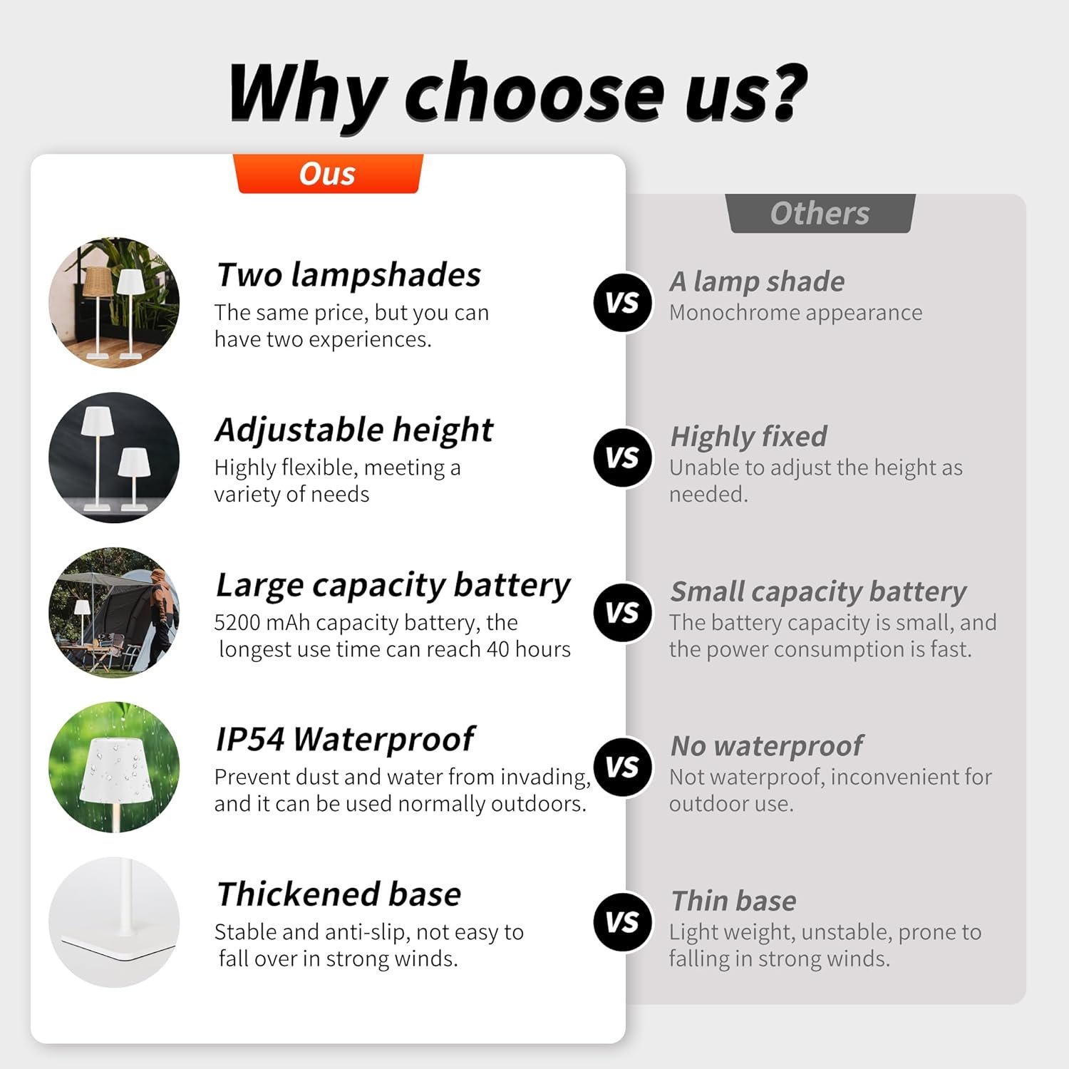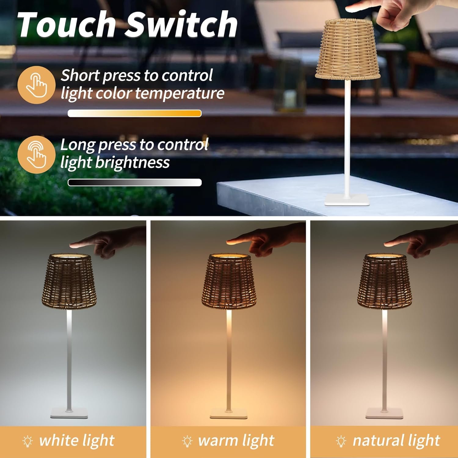 【IP54 Waterproof & Cordless Portable Design】Designed as a wireless table lamp, this battery-operated table lamp cordless features an IP54 waterproof rating, making it perfect for outdoor activities like camping, picnics, or use at bars and restaurants. Indoors, it serves beautifully as a patio lamp, dining table lamp, bedside lamp, or side table lamp, eliminating the hassle of power outlets.