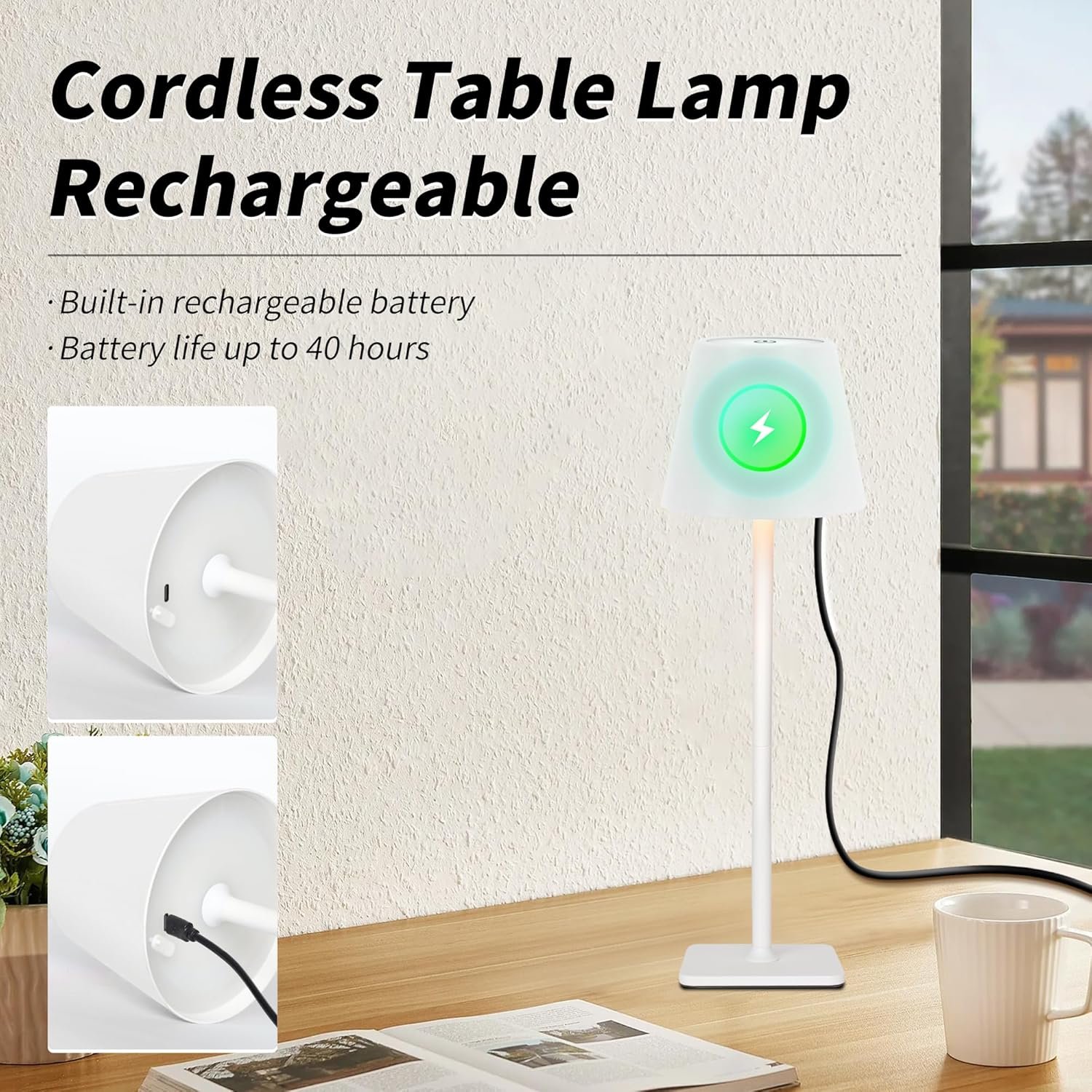 【Rechargeable Battery for Extended Use】Equipped with a built-in 5200 mAh rechargeable battery, this wireless table lamp can illuminate your space for 8 to 40 hours on a single charge. It fully charges in just 6 hours via USB Type-C, making it a reliable option for a portable LED table lamp that fits your lifestyle.
