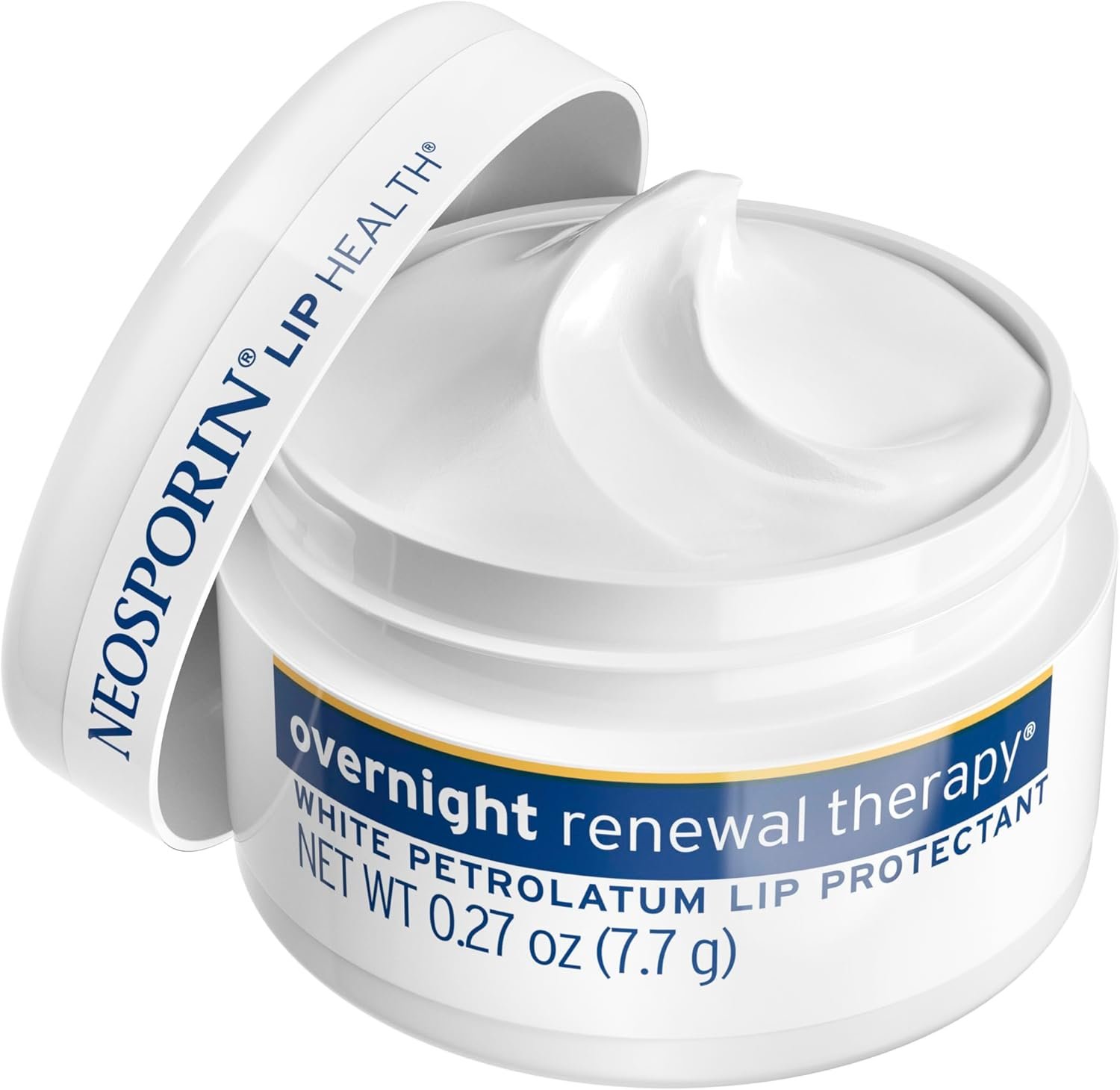 Twin pack containing two 0.27-ounce tubs of Neosporin Lip Health Overnight Renewal Therapy Lip Protectant with white petrolatum to help hydrate and nourish your lips, the most fragile skin on your body