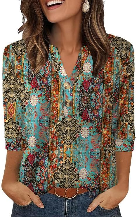 Customers find the shirt comfortable and well-fitting, particularly appreciating its 3/4 sleeve length and soft, wrinkle-free material. The top receives positive feedback for its appearance, with one customer noting it blends well with various pants colors, and customers like its fabric quality, with one describing it as thin soft cotton. While some customers say it runs true to size, others mention it runs small.