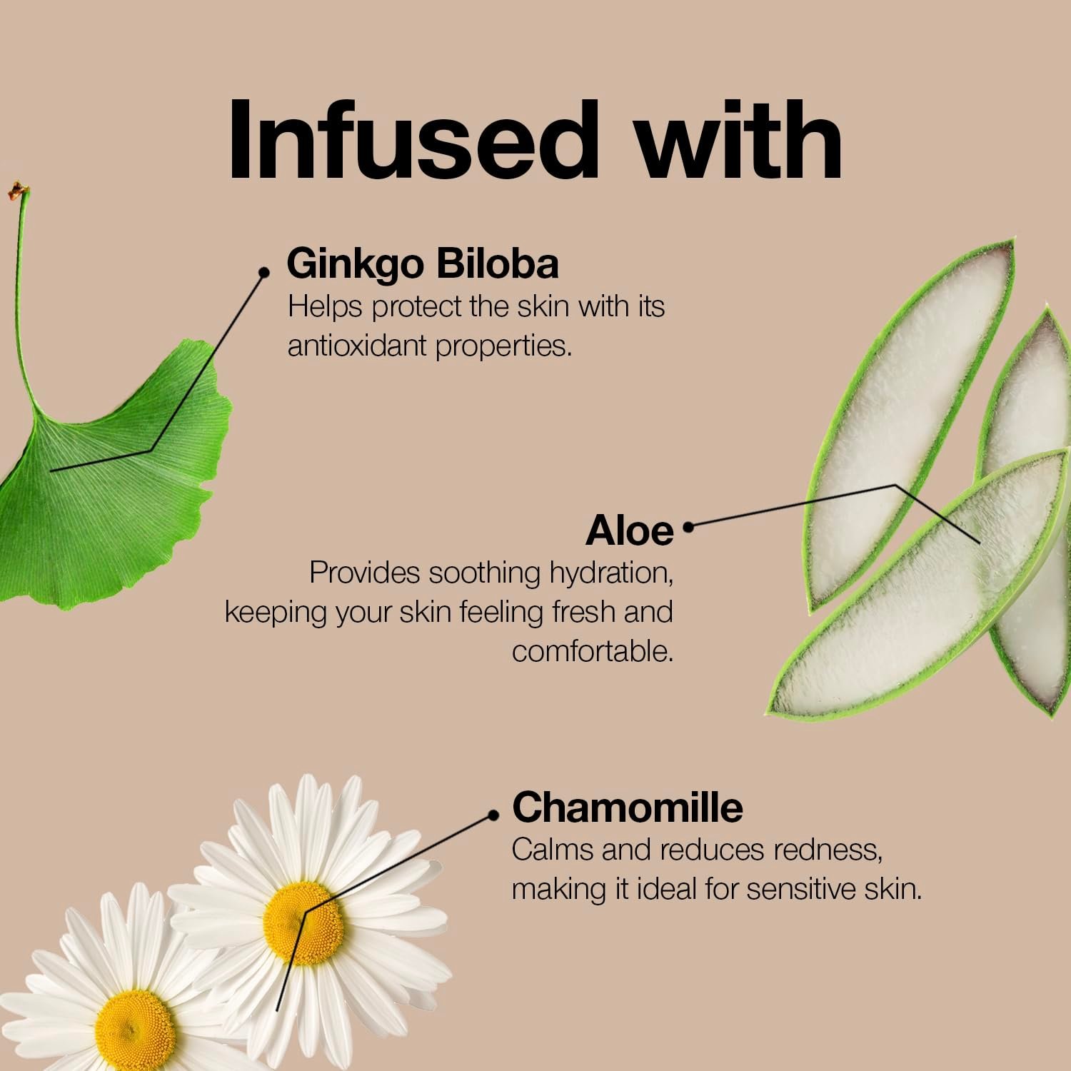 BOTANICAL AND VITAMIN INFUSED COSMETICS: Infused with apricot, chamomile, ginkgo biloba, aloe (skin conditioning), coconut oil (skin softening) & ginseng