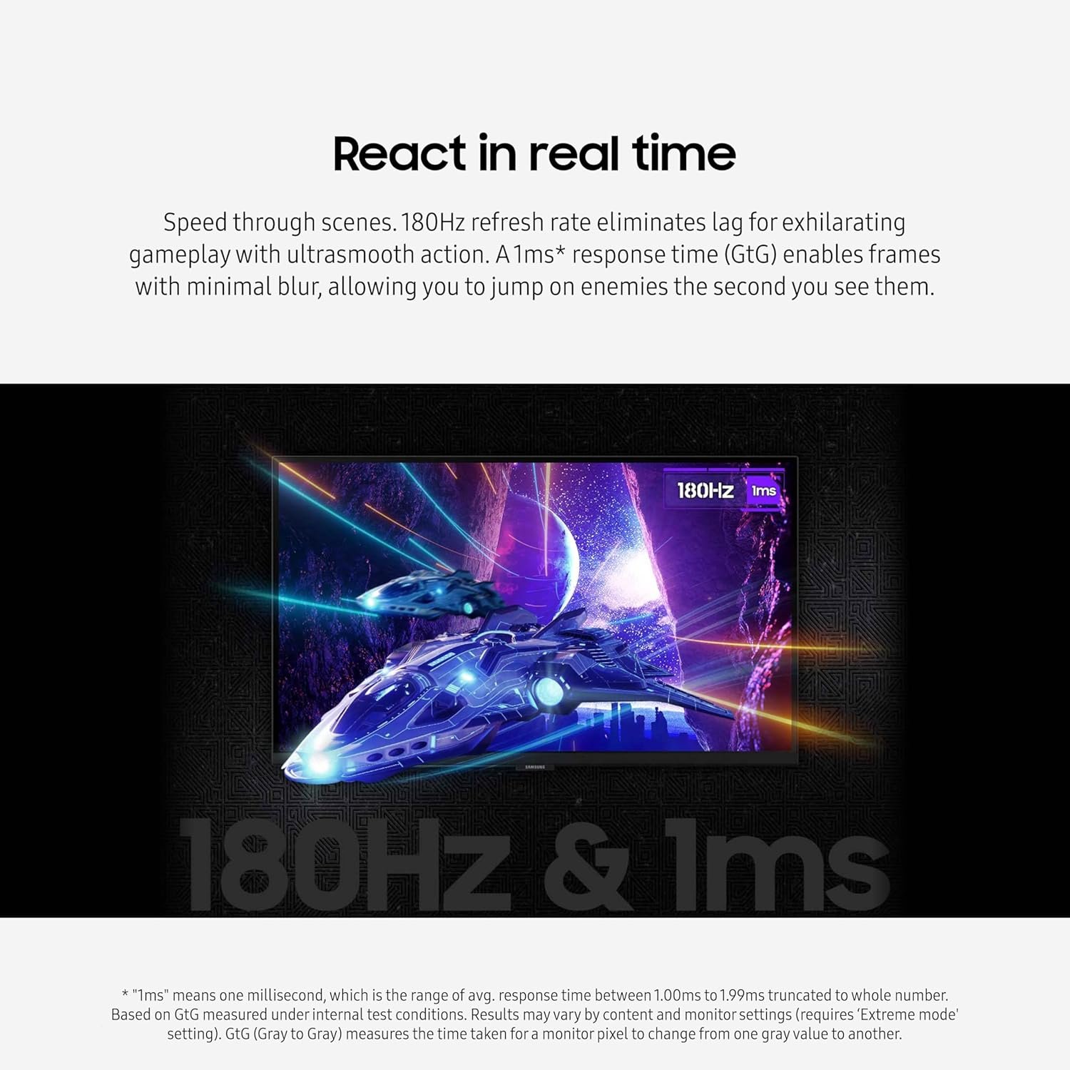 REACT IN REAL TIME: Speed through scenes; 180Hz refresh rate eliminates lag for exhilarating gameplay with ultrasmooth action; A 1ms¹ response time (GtG) enables frames with minimal blur, allowing you to jump on enemies the second you see them