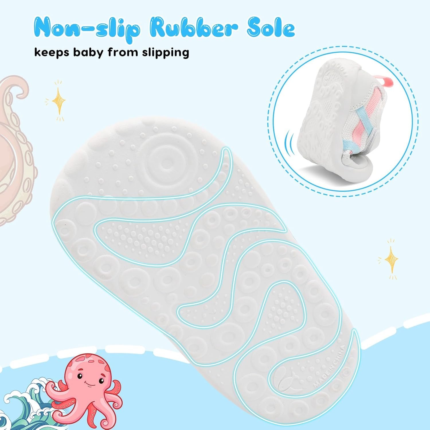 Feature: Lightweight, breathable, adjustable Uppers: Breathable Mesh upper Outsole: Rubber outsole with nonslip texture Closure: Adjustable hook and loop closure Occasion:The baby boys girls shoes is great for indoor and outdoor activities, such as first walking, playing in kindergartens, walking in the parks, having a camping trip, and playing around the house, etc