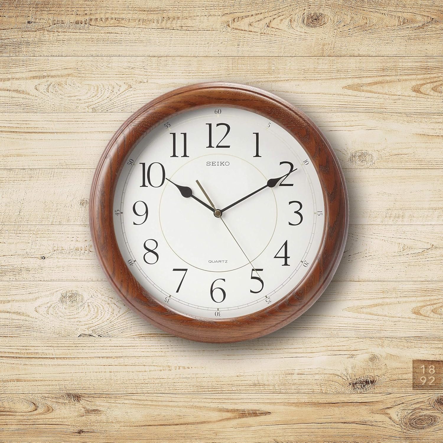 This dark brown solid oak clock with Arabic Numbers and quiet sweep is 13 inches round and brings warmth and sophistication to the home as well as office space. Classically designed, it features a brown case with a wooden grain finish, glass cover, and a quiet sweep second hand. Powered by 1 AA battery (included). Overall dimensions: 13 X 13 X 1.5 inches. All Seiko clocks are equipped with quartz movement making it the most accurate at time keeping.