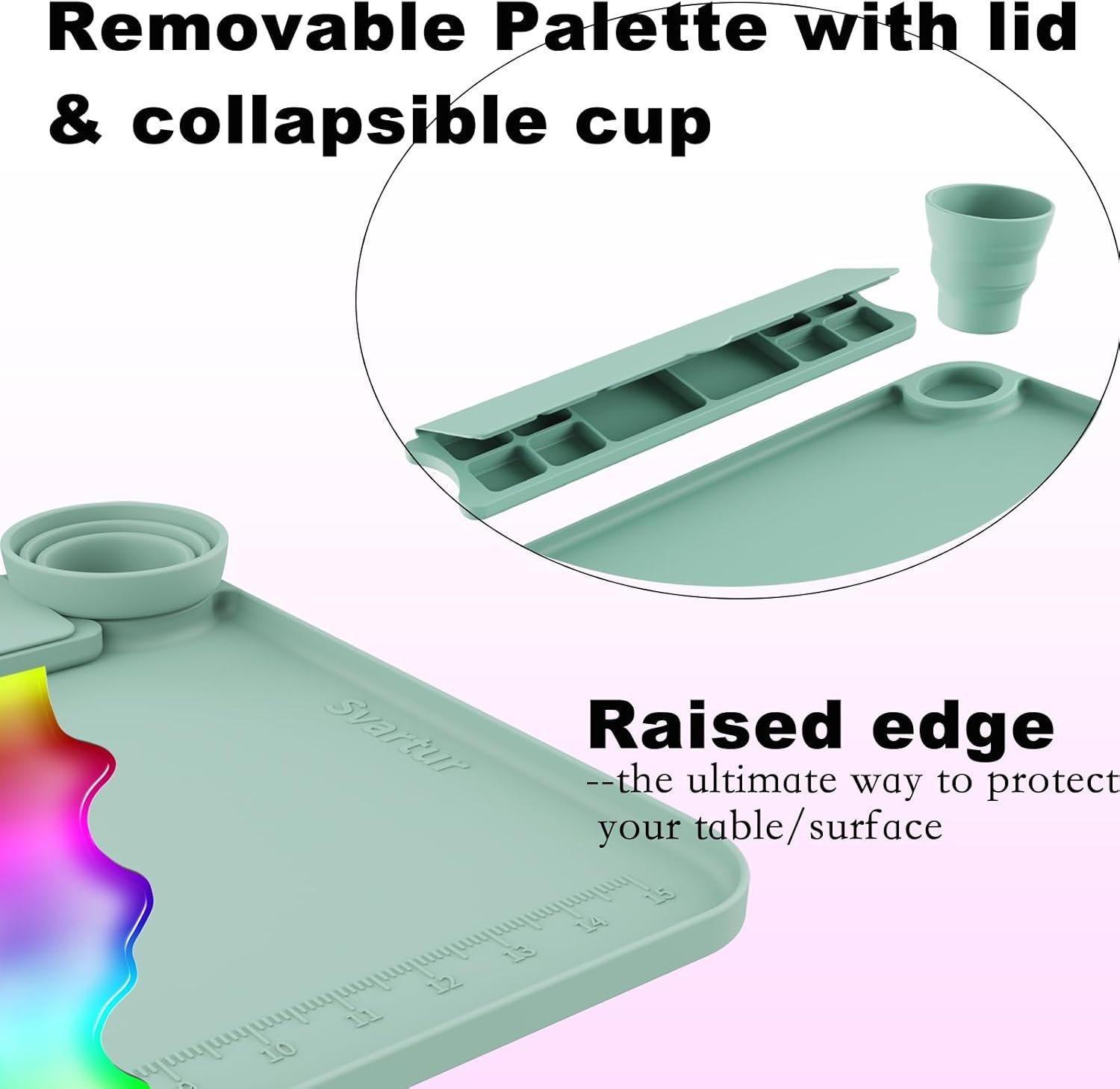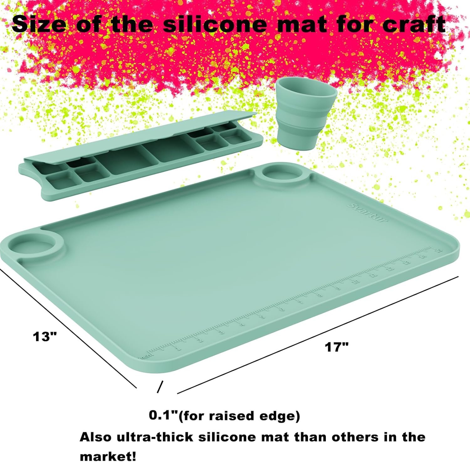 【Smart Design Features】: Designed with versatility in mind, the detachable painting well and cup on the silicone artist mat offer expanded functionality beyond painting, catering to a wide range of DIY projects. Additionally, the imperial measurement ruler aids in precise project measurements. Enhance your crafting experience with this innovative mat.