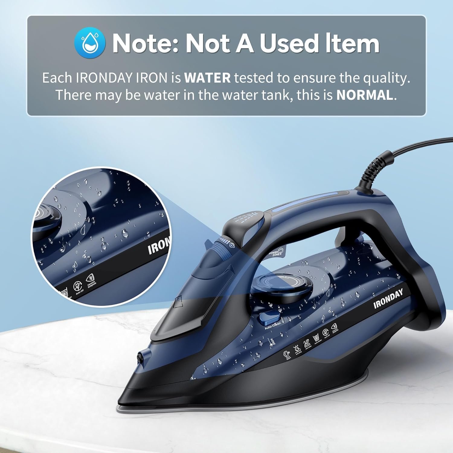 [Quality Tested] Each IRONDAY steam iron is WATER TESTED before leaving the factory to ensure the quality and safety of the product, so some water may remain in the water tank, which is NOMAL for the pre-testing process
