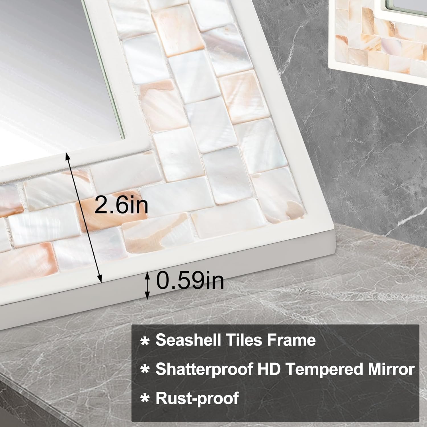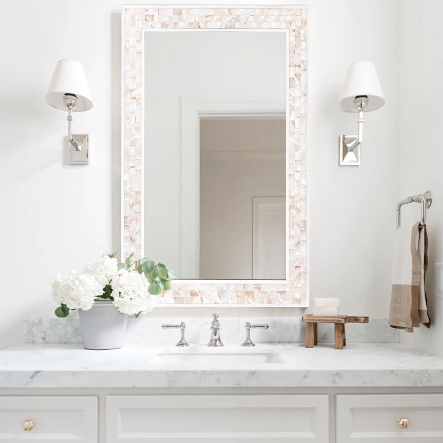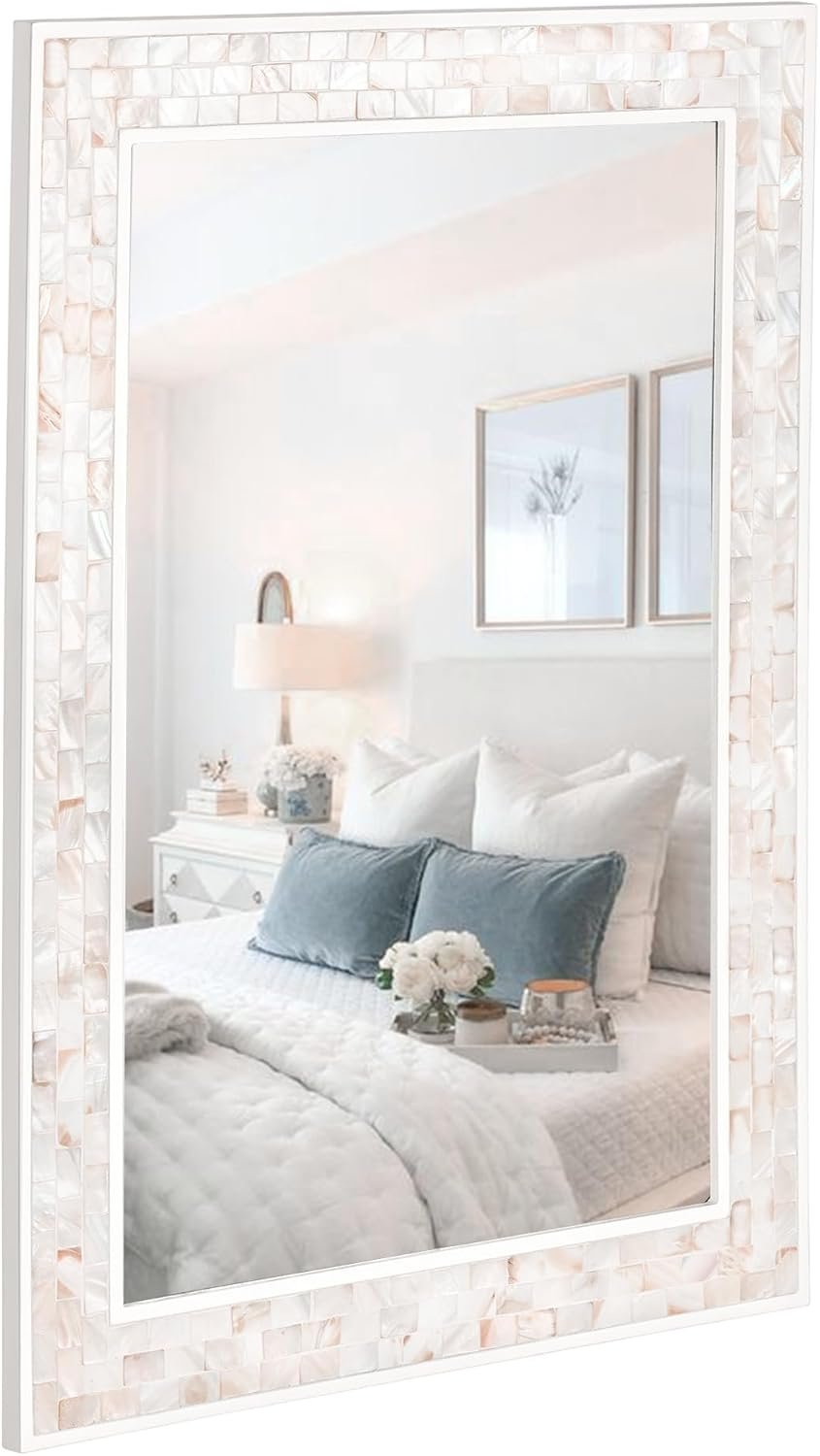 Coastal Beach Style: Three rows of mother of pearl encircle the frame. The natural shell shimmers with warm white and cream tones., when you stand in front of it, you’ll be pleasantly surprised to find yourself more refined.
