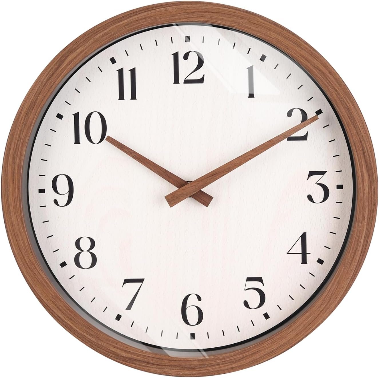 Topkey 12 Inch Silent Wall Clock with Wooden Hour and Minute Hands – Round Wood-Like Frame & White Dial for Home Office Kitchen Decor – Wooden Brown