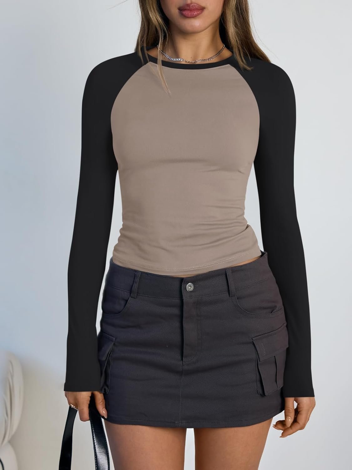 Customers find the shirt soft, smooth like butter, and appreciate its trendy appearance, with one mentioning its two-tone raglan sleeve design. The material is amazing, and customers describe it as comfortable and very stretchy, making it a great workout top. While some customers say it’s sized right, others mention it runs small. The fit receives mixed feedback, with some finding it nice while others say it’s a little snug.